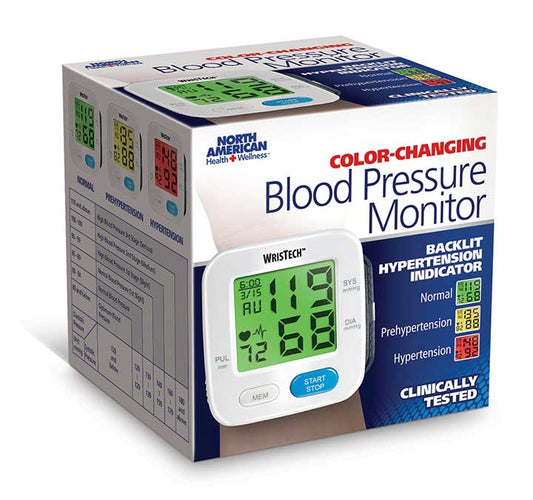 WrisTech JB7608 Blood Pressure Monitor with Adjustable Wrist Cuff Color Changing LCD Monitor
