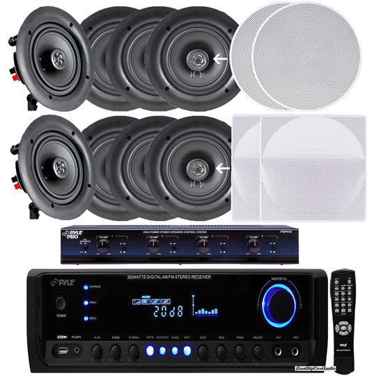 4 Pairs 150W 5.25" In-Wall / In-Ceiling White Speakers w/ Receiver / Vol Ctrl