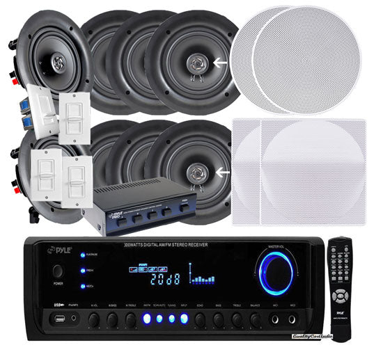 4 Pairs 150W 5.25" In-Wall / In-Ceiling White Speakers w/ Receiver w/ Vol Ctrl