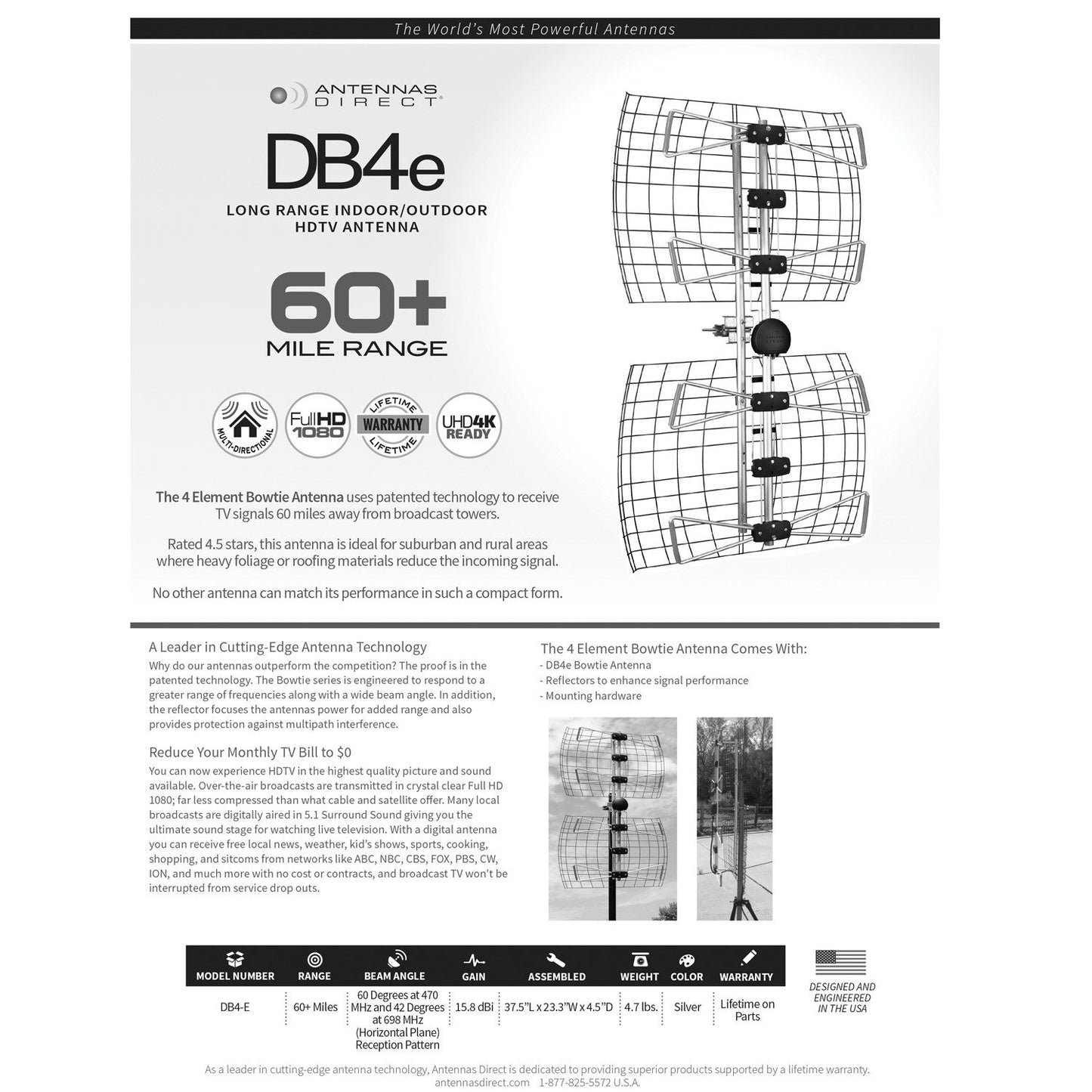 The Antennas Direct DB4-e Ultra Long Range Indoor/Outdoor HDTV Antenna has 3x the power and half the size. This antenna is ideal for problematic areas challenged with receiving signals through heavy foliage outdoors.