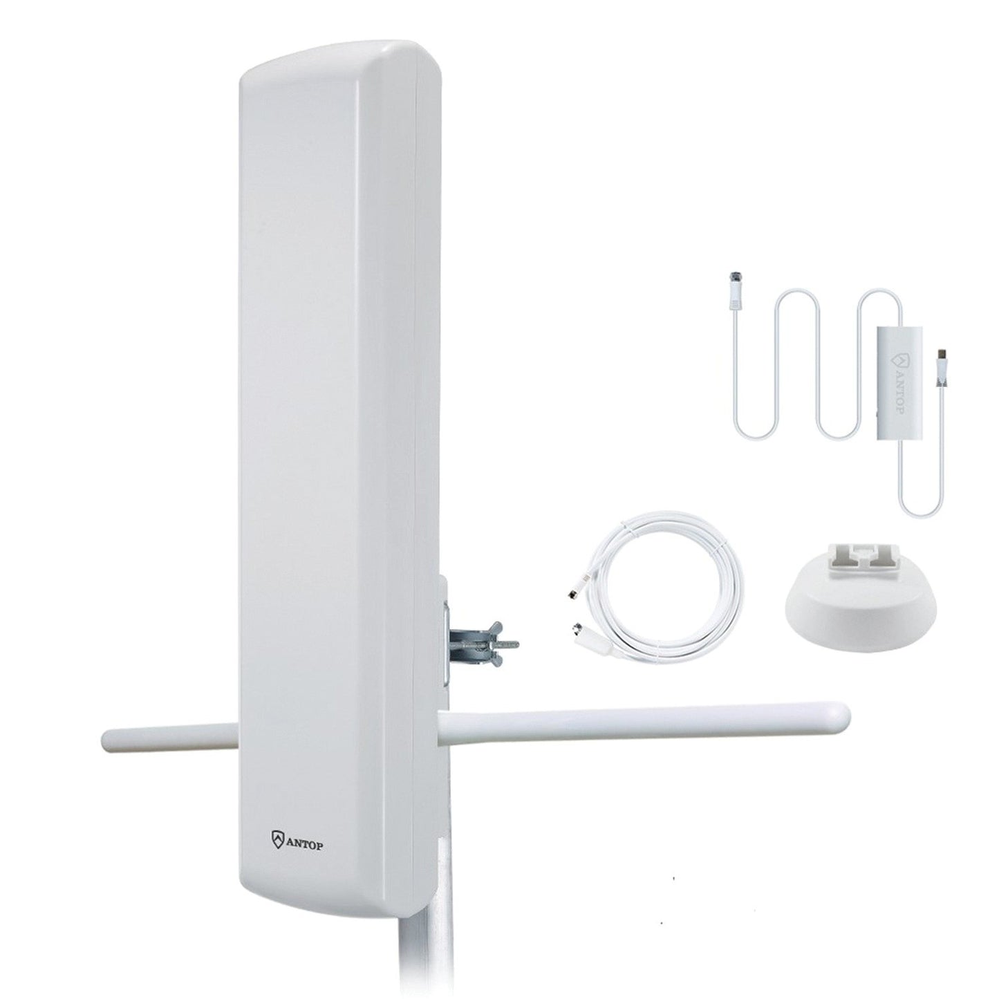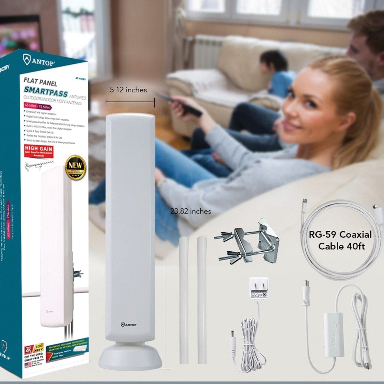 Cut the cord, watch FREE local TV with the AT-402BV Big Boy Outdoor HDTV Smartpass Amplified Antenna, a whole-house solution from ANTOP! The AT-402BV is powerful enough to feed multiple TVs and is engineered with a patented design to match performance of traditional mechanical antennas. The AT-402BV includes VHF enhancer rods, the exclusive ANTOP Smartpass Amplifier, and a 4G LTE Filter. The AT-402BV features an amplified signal reception range of up to 75 miles and multi-directional reception to receive free local over-the-air digital TV signals from networks such as ABC, CBS, NBC, Fox, Univision, and others. It supports HDTV, 1080P TV, 4K Ultra, and is compatible with digital converter boxes.