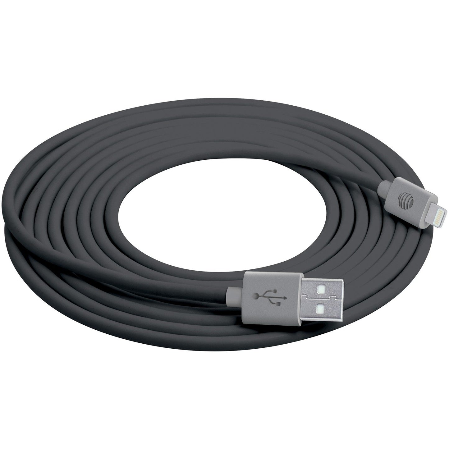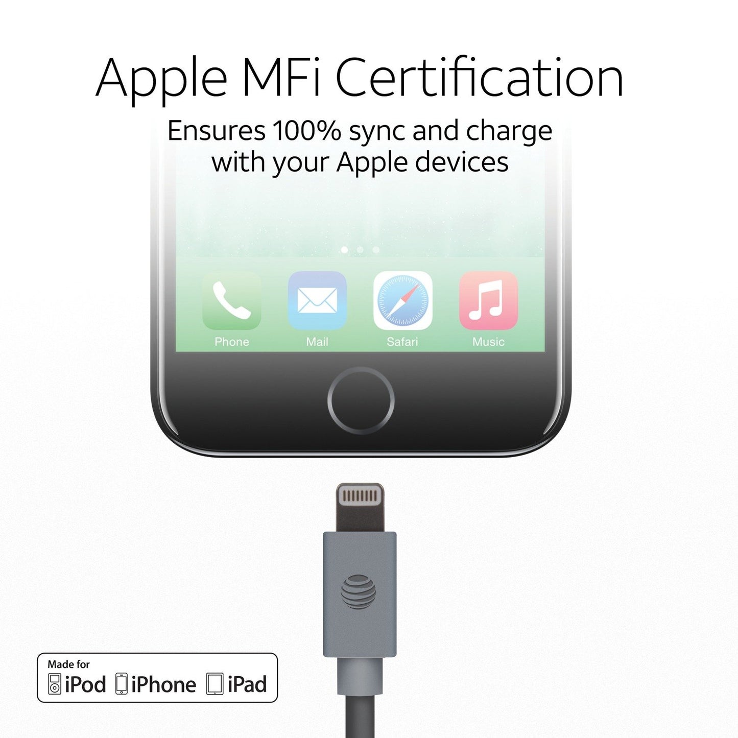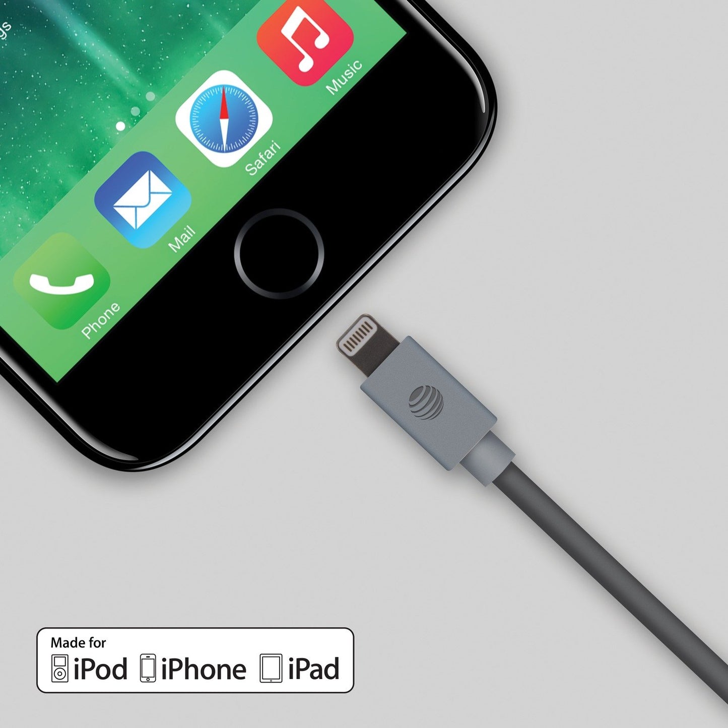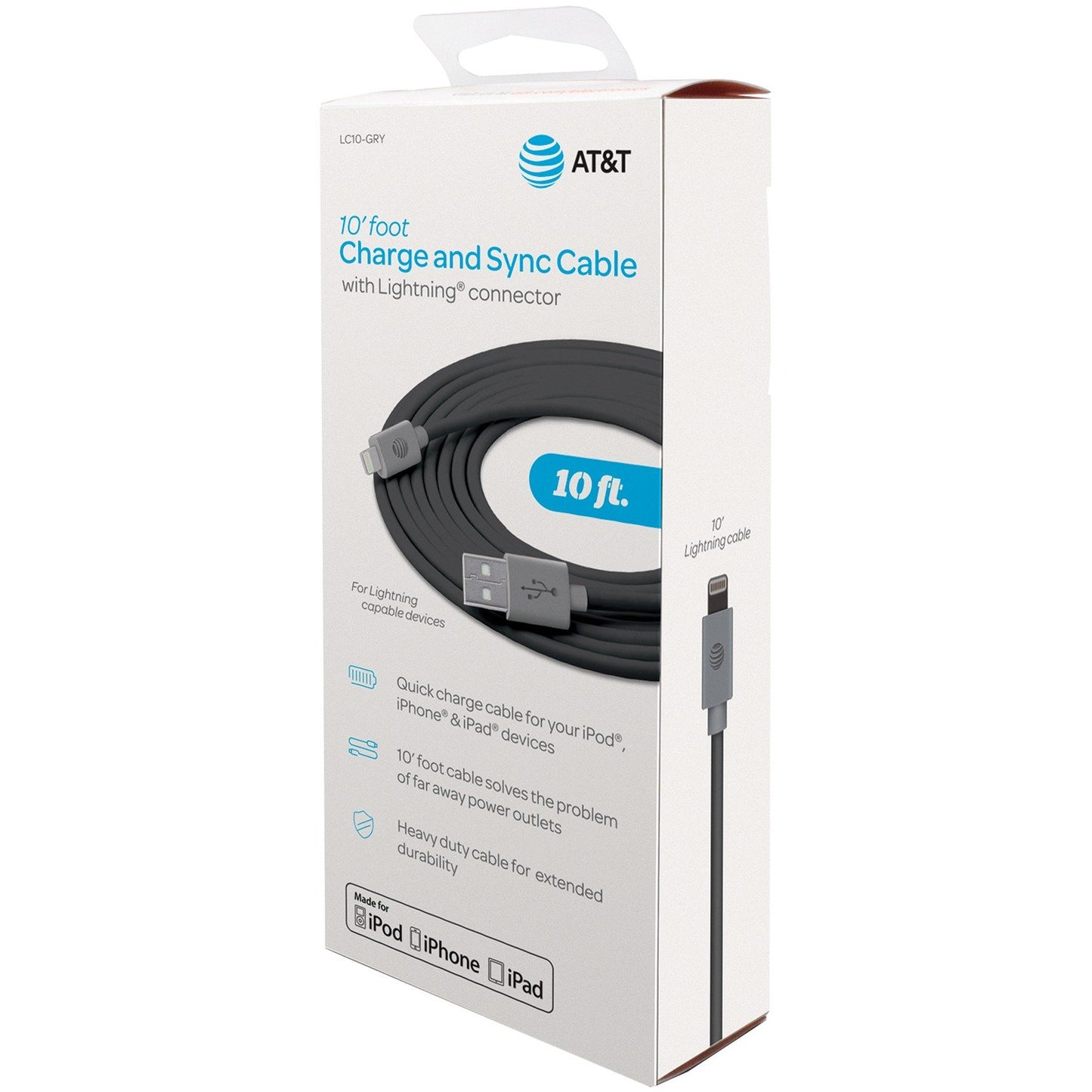 Charge and sync your Apple phone or tablet with this MFi certified AT&T USB Cable with Lightning Connector, 10 ft. (Gray). A heavy-duty 26-gauge power line carries the 10-watts needed to charge an Apple iPad or any iPhone. Stay topped off and charged wherever you go with the 10-ft. AT&T USB Cable with Lightning Connector.