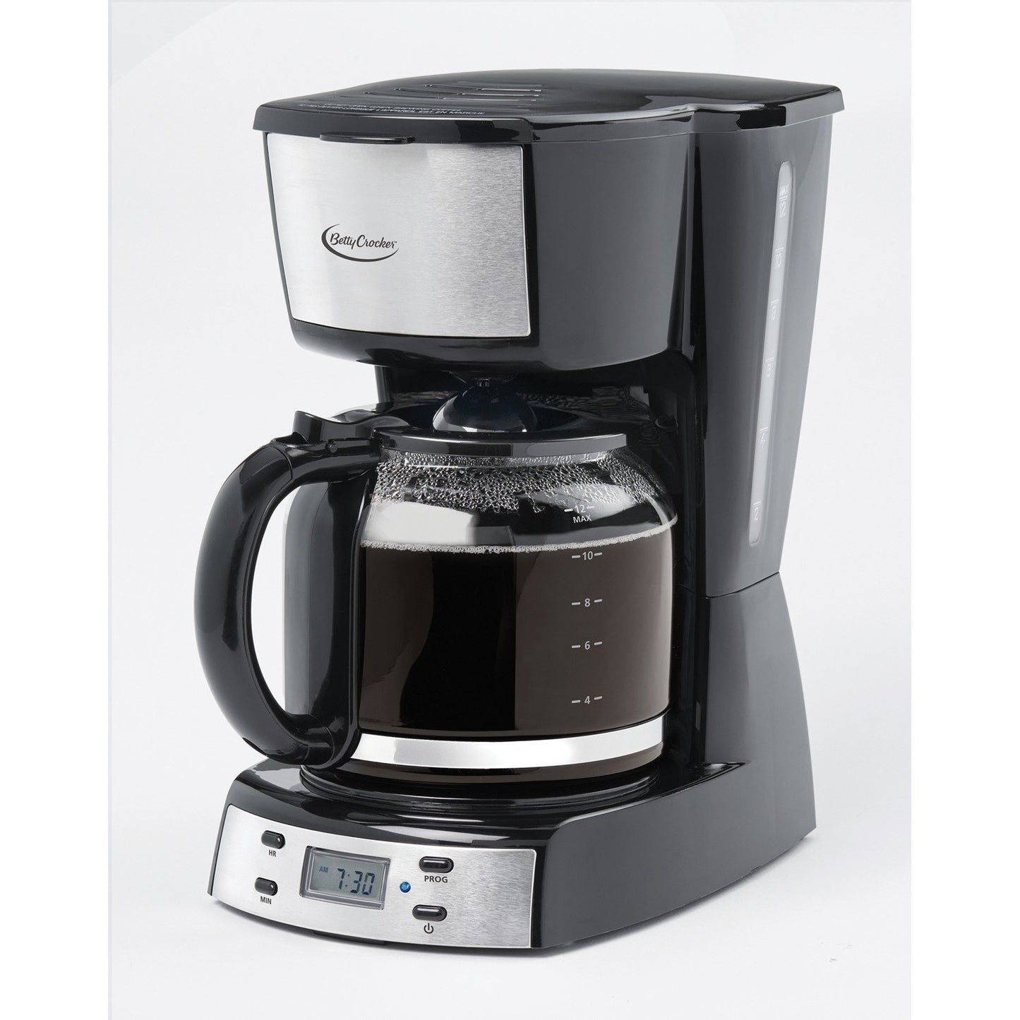 Have your morning coffee waiting for you by using the 24-hour LCD programmable clock on the Betty Crocker 12-Cup Stainless Steel Coffee Maker. It is capable of delivering up to 12 cups of delicious coffee into the heat-resistant glass carafe and features stainless steel accents, a nonstick warming plate and automatic 2-hour shutoff. For those who can't wait for that first cup, a pause and pour feature has been included.