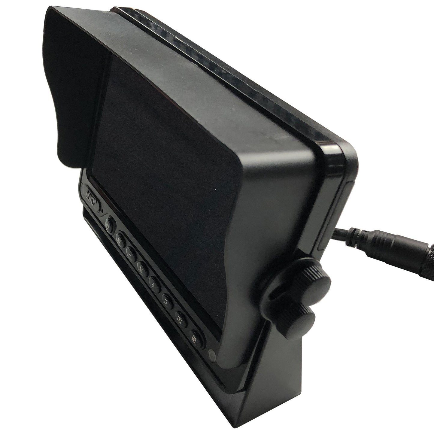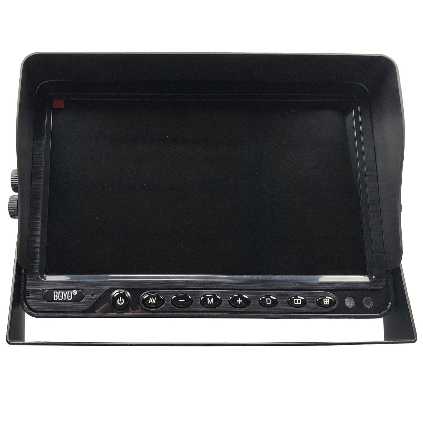 The BOYO Vision VTM9003QFHD is a 9 in. AHD/CVBS 4-Channel Full HD Quad-Display Monitor with built-in DVR. The 1920 x 1080 resolution monitor with built-in speaker has 4 audio and video inputs and is compatible with AHD 1080p, 720p, and CVBS. The monitor also has screen saver mode and adjustable color, contrast, and brightness. There's even a detachable sunshade for better visibility. The DVR has 4-channel recording and records at 1080p. Memory capacity is 256 GB. A full-function remote is included.