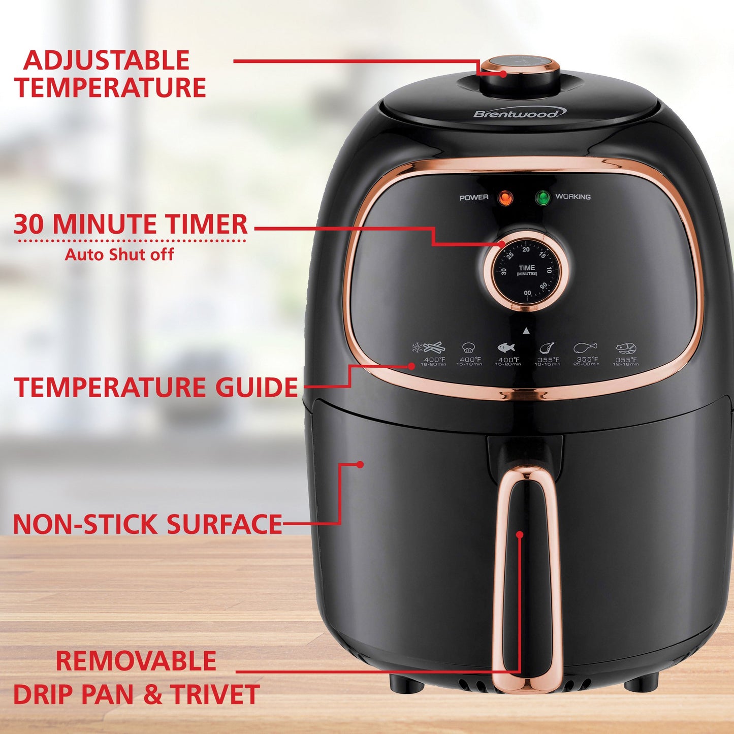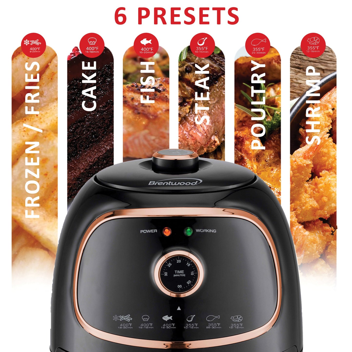 Fry food to perfection with the Brentwood 2 Qt. 1,200 Watt Electric Air Fryer with Timer and Temperature Control. This fryer cooks quickly and evenly without the guilt of extra fat and calories. It requires little-to-no oil to beautifully cook french fries, onion rings, chicken wings, steak, roasted veggies, and more. Use the quick-reference temperature guide and the 30-minute timer with auto-shutoff for fast, crispy results. The Black/Copper fryer's cool-touch, removable fry basket makes serving easy. The frying pan and basket is made with a nonstick surface for effortless cleanup.