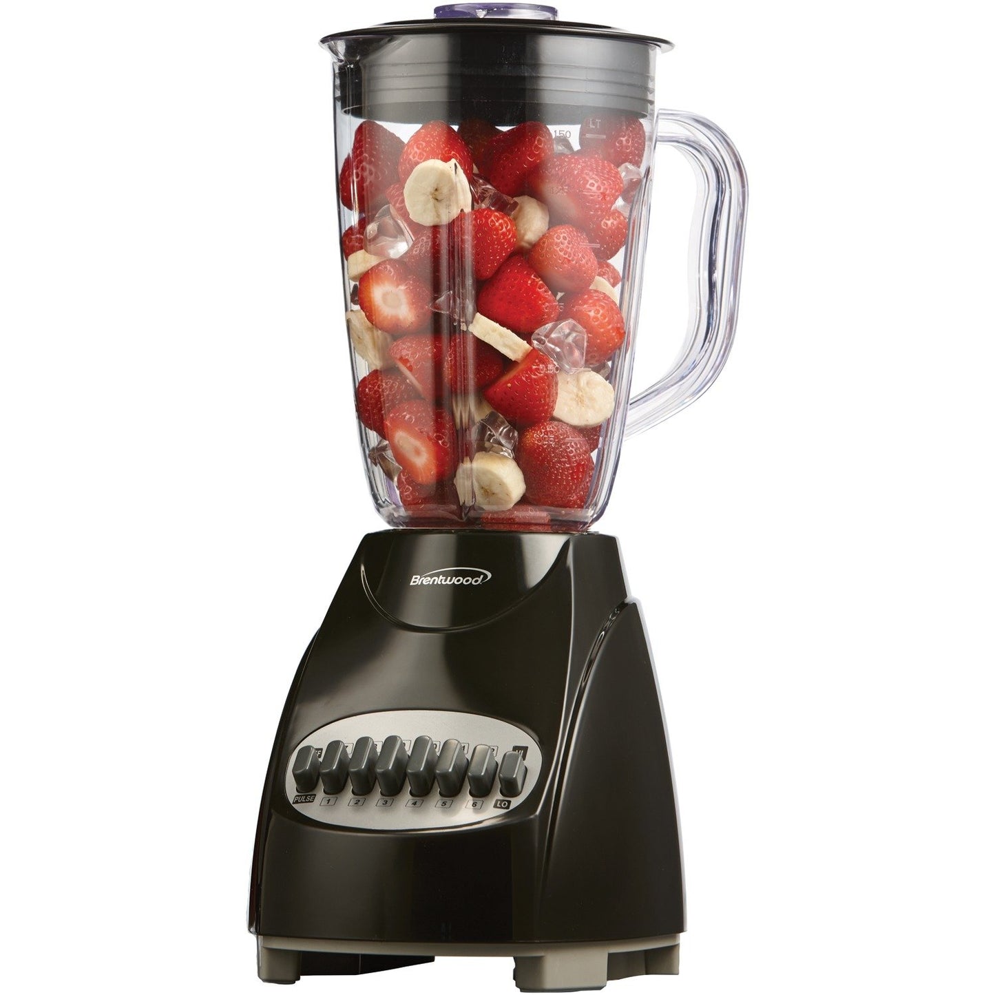 The powerful 350 watt Brentwood Appliance JB-220R 50 oz. 12-Speed + Pulse Electric Blender uses stainless steel blades to easily crush and pulverize ice. Choose between 12 speeds to blend delicious smoothies, thick shakes, hearty protein and more. The black blender includes a dishwasher safe BPA-free plastic jar and lid and has convenient cord storage.