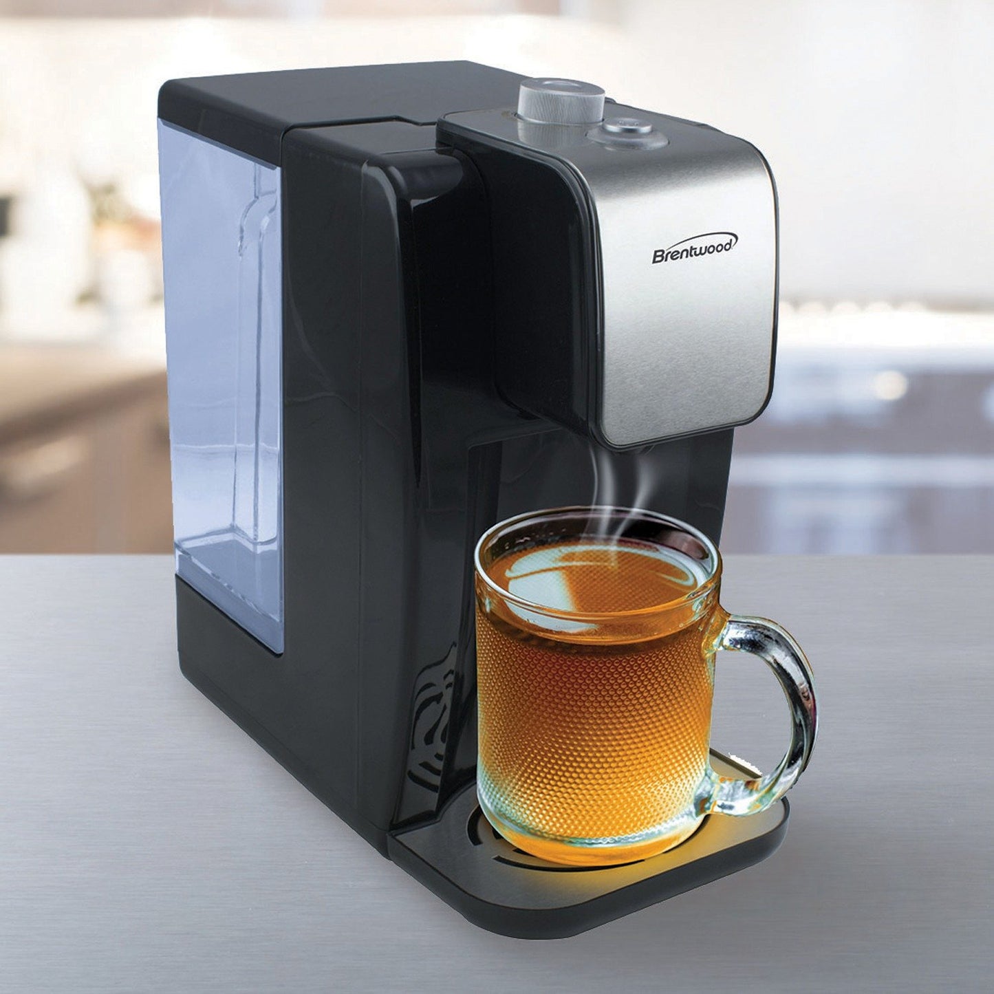 Use the Brentwood Appliances KT-2200 2.3 Qt. Single-Touch Instant Hot Water Dispenser to prepare your favorite hot drinks. Enjoy for tea, hot chocolate, coffee, a squeeze of lemon and more. A single touch dispenses 6 oz. of water in under 10 seconds. The is black/stainless steel hot water dispenser has removable parts for quick cleanup. This appliance is entirely BPA-free and FDA approved.