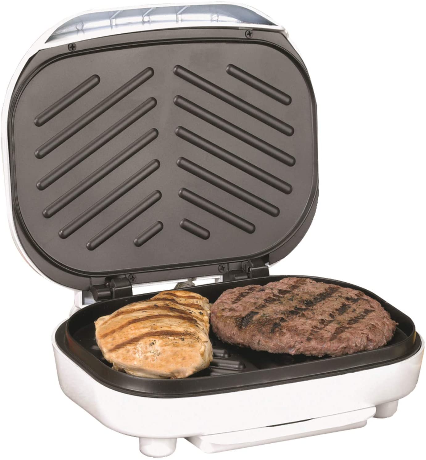 No need to spend the time, mess and bucks to grill outside—especially if you just have a few items. The 600-watt Electric Contact Grill, 2-Slice Capacity, from Brentwood Appliances makes indoor low-fat grilling easy. The TS-605 adds sear marks to whatever you cook inside. Its nonstick coating makes cleanup easier, plus the drip tray is dishwasher safe! The Contact Grill stands upright for compact storage. Weight: 3.75 lbs. Dim: 3.75"H x 9"W x 8"D.