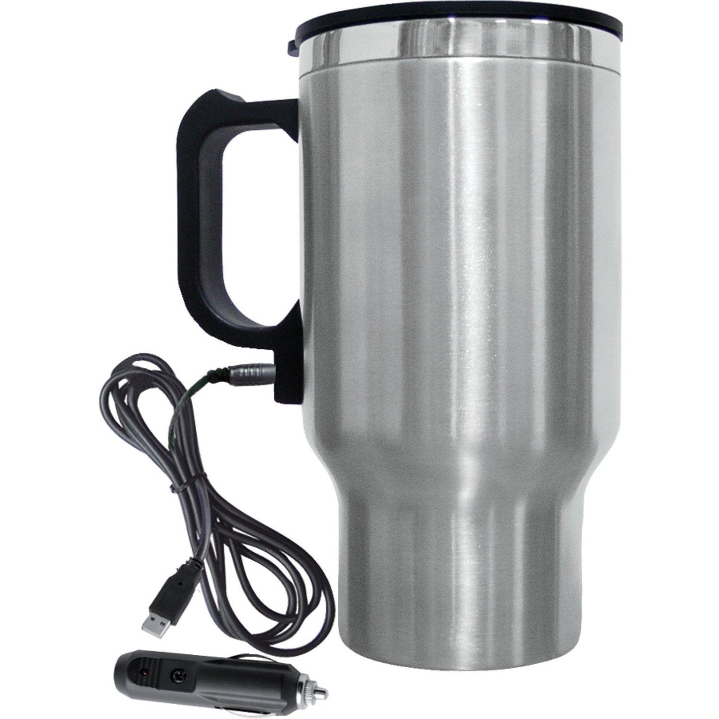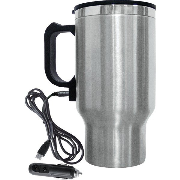 The Brentwood Appliances' CMB-16C 16-Ounce Stainless Steel Heated Travel Mug with 12-Volt Car Adapter heats up fast and keeps liquids hot while plugged in. Now it's easy to conveniently take coffee and tea on the go with the built-in handle and included travel lid. Contents stay hot even when the mug is unplugged, thanks to stainless steel double wall vacuum insulation.