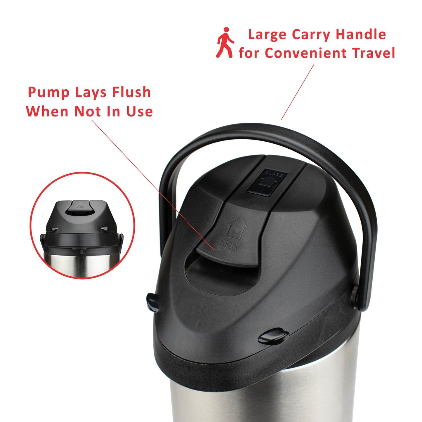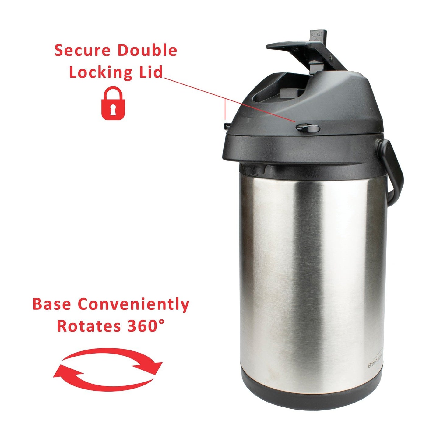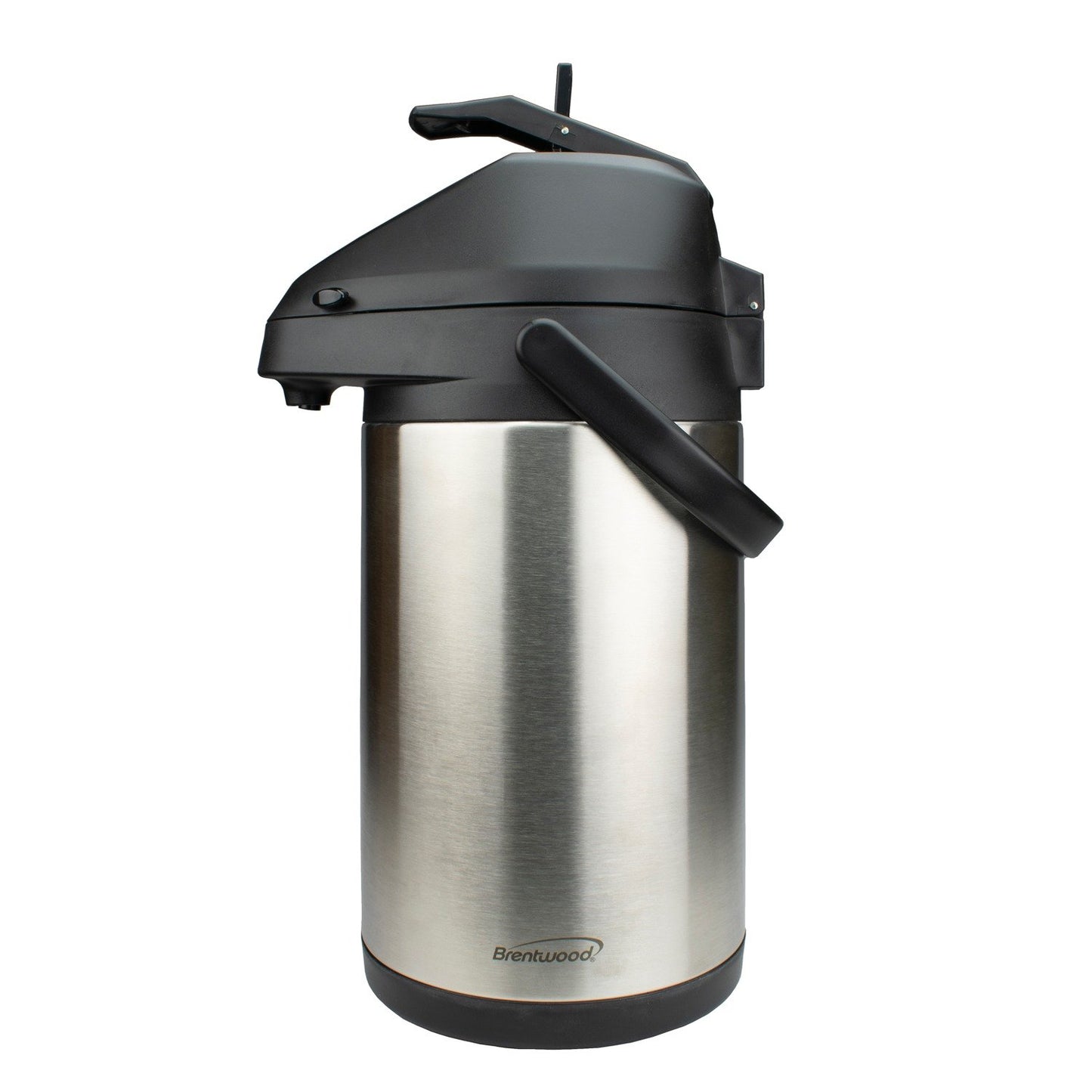 The Brentwood Appliances' CTSA-3500 3-1/2 Liter Airpot Hot and Cold Drink Dispenser keeps coffee, tea, water and more hot or cold for hours. It features an easy to use lever action pump, robust carry handle, 360° rotating base, large pour spout, wide mouth and safety locking lid. This beautifully brushed stainless steel airpot looks great in any setting.