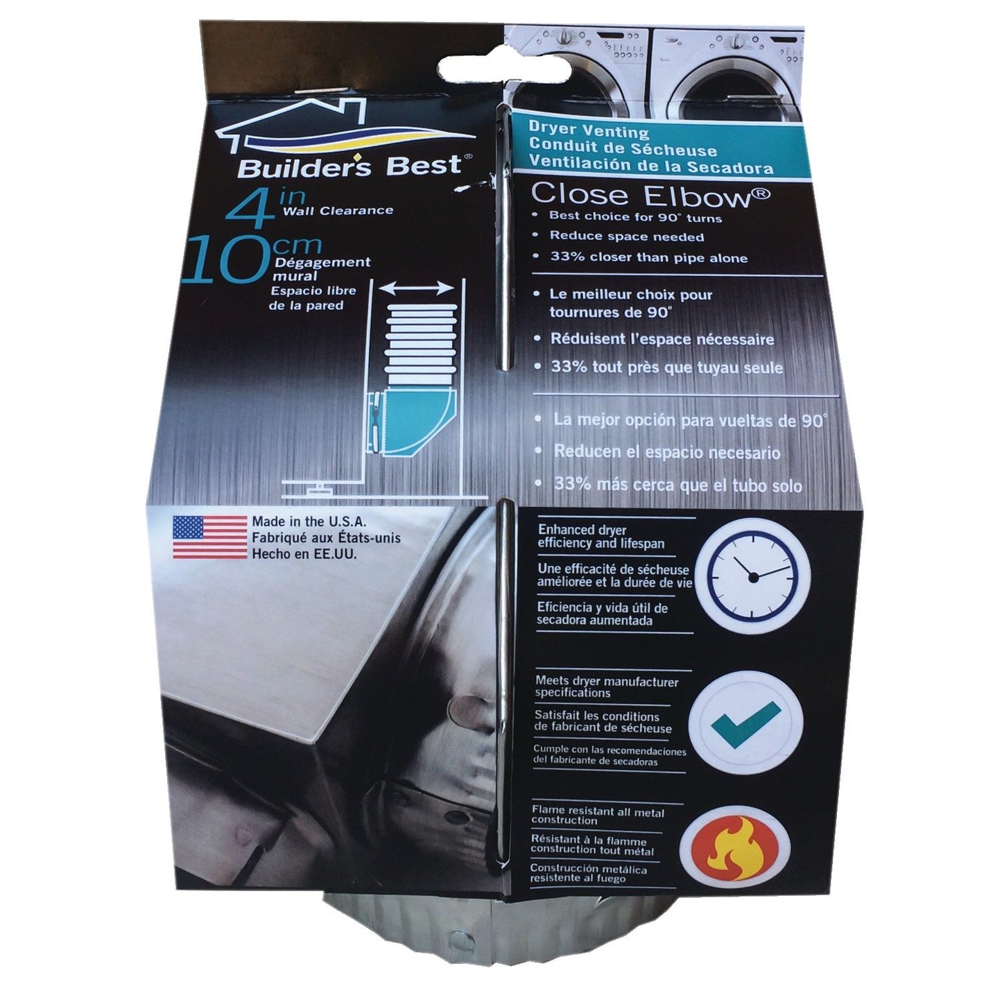 Builder's Best is a nationwide, high-performance manufacturer of quality venting solutions, designed to meet specific constraints of areas such as dryer venting, bathroom fan venting, fresh-air ventilation and general venting. The Close Elbow is ideal for dryer use. Its ability to turn 90° within 4 in. makes it very versatile.