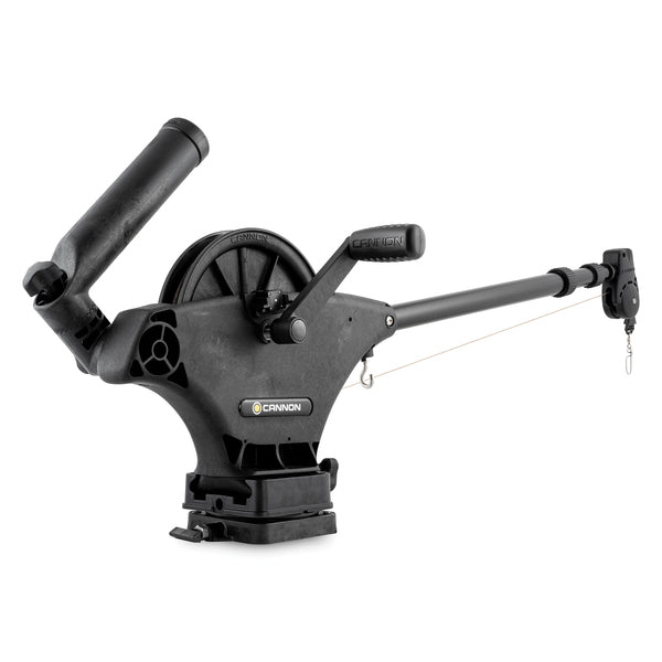 • For use when trolling in deep water or salmon fishing; used to manually raise or lower bait using hand-operated crank;• Telescopic 24-in. to 53-in. stainless steel boom; composite spool comes pre-spooled with 200 ft. of 150-lb. stainless steel cable;• 1-hand clutch deploy to position bait precisely and easily with full control;• Easy-to-read 3-digit depth counter to always know where weights are;• 2:1 retrieval rate makes getting lines out of water fast and nearly effortless; ergonomic crank handle;• Enclosed boom end prevents lines from jumping when deploying or retrieving weights;• Integrated ball storage hook so there's no need to remove weight when done;• Dual axis rod holder includes 1 rear-mount rod holder;• Limited lifetime warranty;• Includes universal mounting base, low-profile swivel base, line terminator, 1 Uni-Line Release, and crank handle;