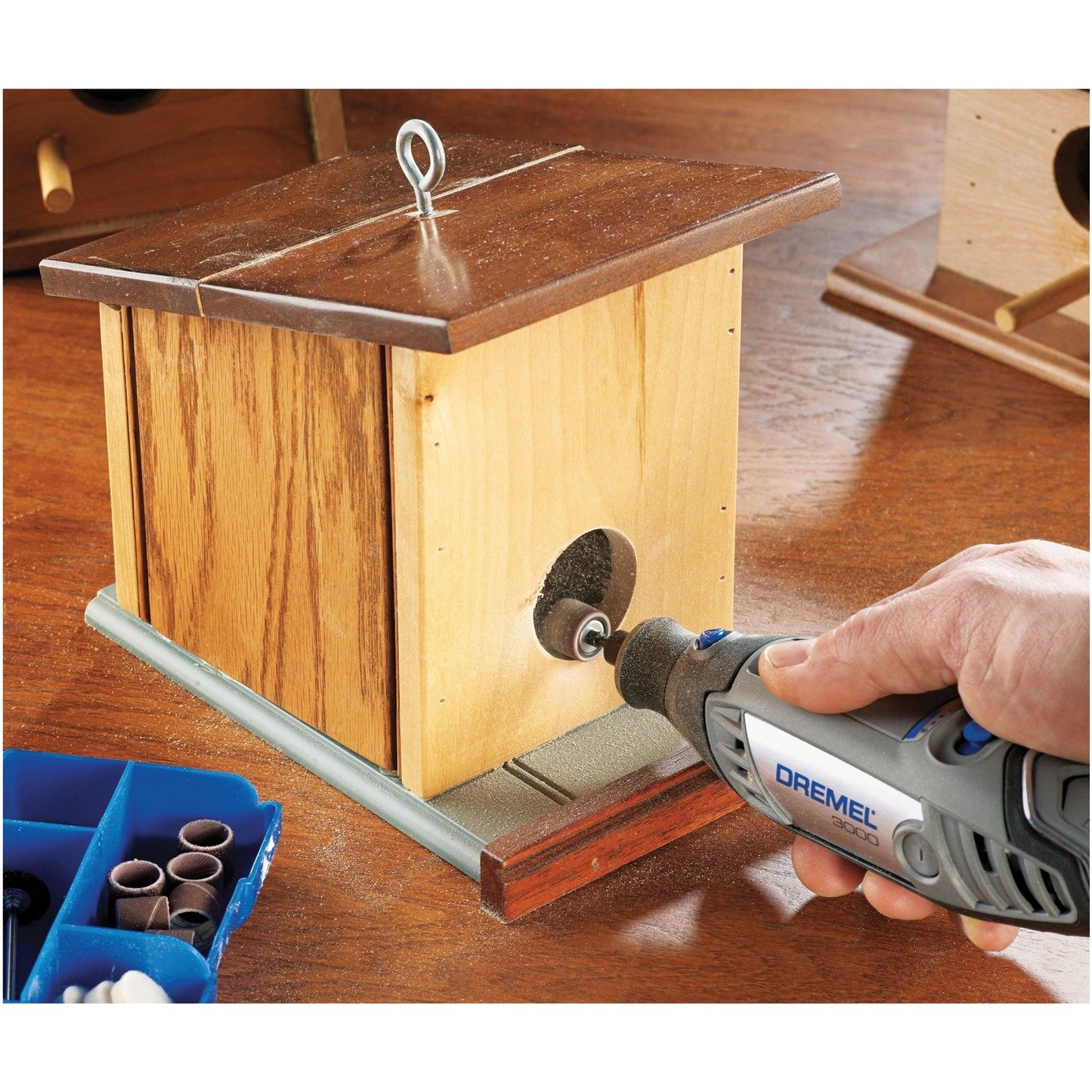 The Dremel 3000 Series Rotary Tool Kit offers everything DIYers need to tackle projects around the house. This kit includes Dremel's most popular rotary tool, which boasts a range of user-requested features that improve the tool’s design and ergonomics. Features include the EZ Twist nose cap with an integrated wrench that allows the nose cap to be used as a wrench to tighten accessories, and an efficient fan design and side vents provide a cooler-running tool that's comfortable for extended periods of use. In addition, the rotary tool features a symmetrical design and a trumpet-shaped nose cap to help facilitate a pencil-grip tool hold. This tool is ideal for cutting, grinding, sanding, carving and polishing.