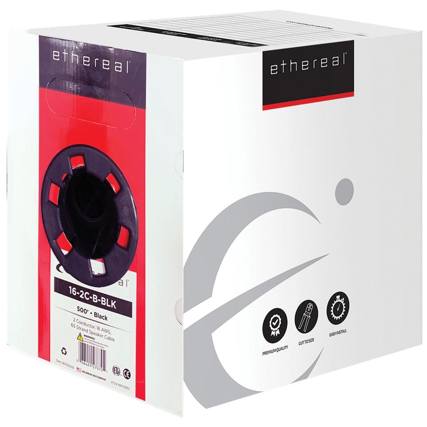 Looking for 16-2C speaker wire? The Ethereal 16-2C 16 Gauge Black Speaker Cable comes unshielded with an overall PVC jacket. It is ideal for indoor use, with applications like intercom systems, security systems, sound, background music, and power-limited control circuits. Jacket thickness is .018 in. and insulation thickness is .012 in. nominal. Overall cable diameter is .204 in. The 500 ft. of cable comes in a tangle-free pull box.