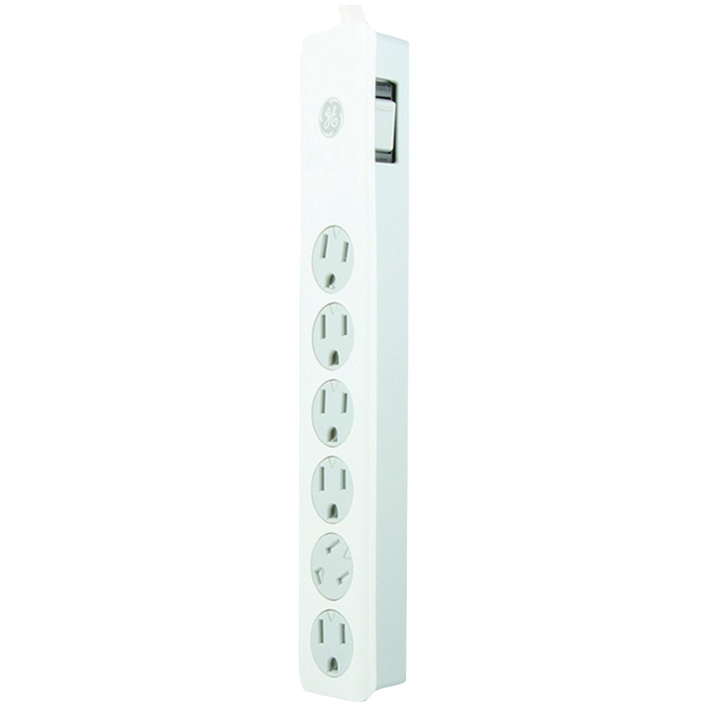 Protect your home's electronics from dangerous power surges with this white 6-Outlet Surge Protector, White, from GE. Plugging directly into your existing outlets, this surge protector features 6 protected outlets with twist-to-lock safety covers that keep your outlets closed when not in use. The surge protection is equipped with an integrated circuit breaker and automatic shutdown technology that permanently shuts down power to the outlets in the event of a surge, ensuring protection for your electronic equipment.