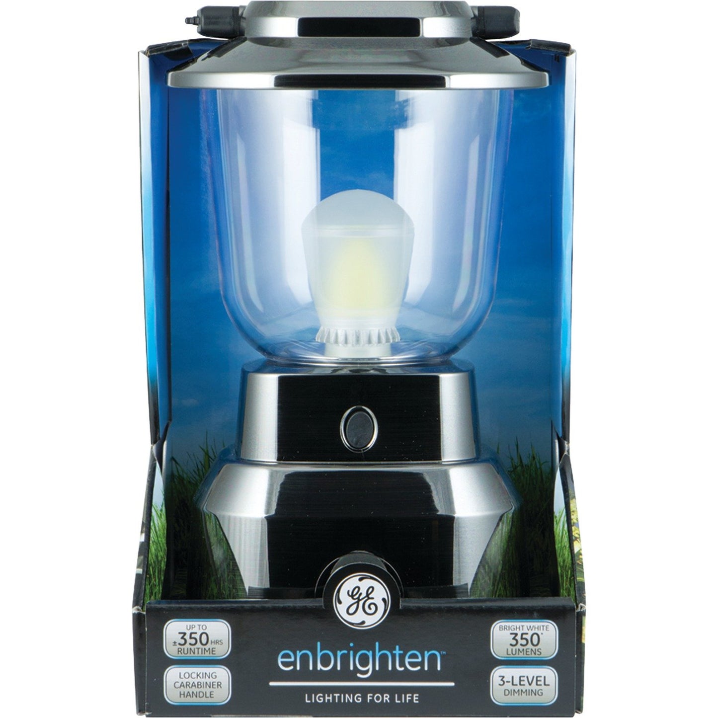 Discover the future of lighting with the GE Enbrighten Lantern. Enbrighten utilizes patented revolutionary LED technology delivering consistent color temperature and unprecedented energy efficiency—with a light source you never have to replace. The Enbrighten Lantern provides an omnidirectional battery-operated solution that emits an ultrabright, ultrawhite 350-lumen light with 360° coverage. The light will not degrade or turn blue over time. Plus Series Battery Technology provides power up to 180 hours on the lantern's low setting and 45 hours on the high setting using 4 "D" batteries. Customize your light output and energy usage with the 3-level dimming feature–low, medium and high settings. Easily hang the lantern anywhere with the locking carabiner handle. The durable, weather-resistant exterior is ideal for camping, emergencies, patios and backyards. Experience endless possibilities with Enbrighten—lighting for life.