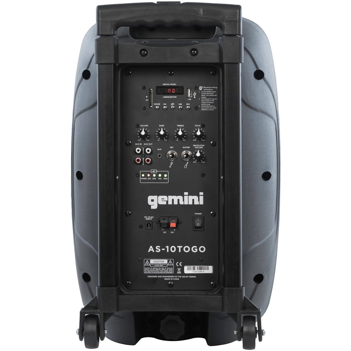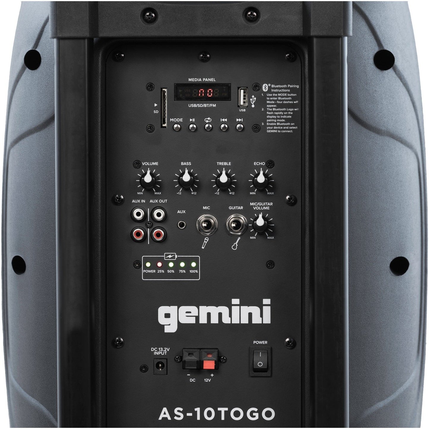 The Gemini AS-10TOGO Portable PA Speakers go wherever they’re needed. At just under 20" tall, they're small enough to fit anywhere. Featuring their own integrated media player, Bluetooth connectivity, FM radio, and the ability to play your own compatible digital files from USB sticks or SD cards – the possibilities are endless. The internal battery is capable of delivering hours of cord-free entertainment and charging is simple. they also feature EQ controls, microphone and guitar inputs, and echo effects that give your music a truly professional sound.