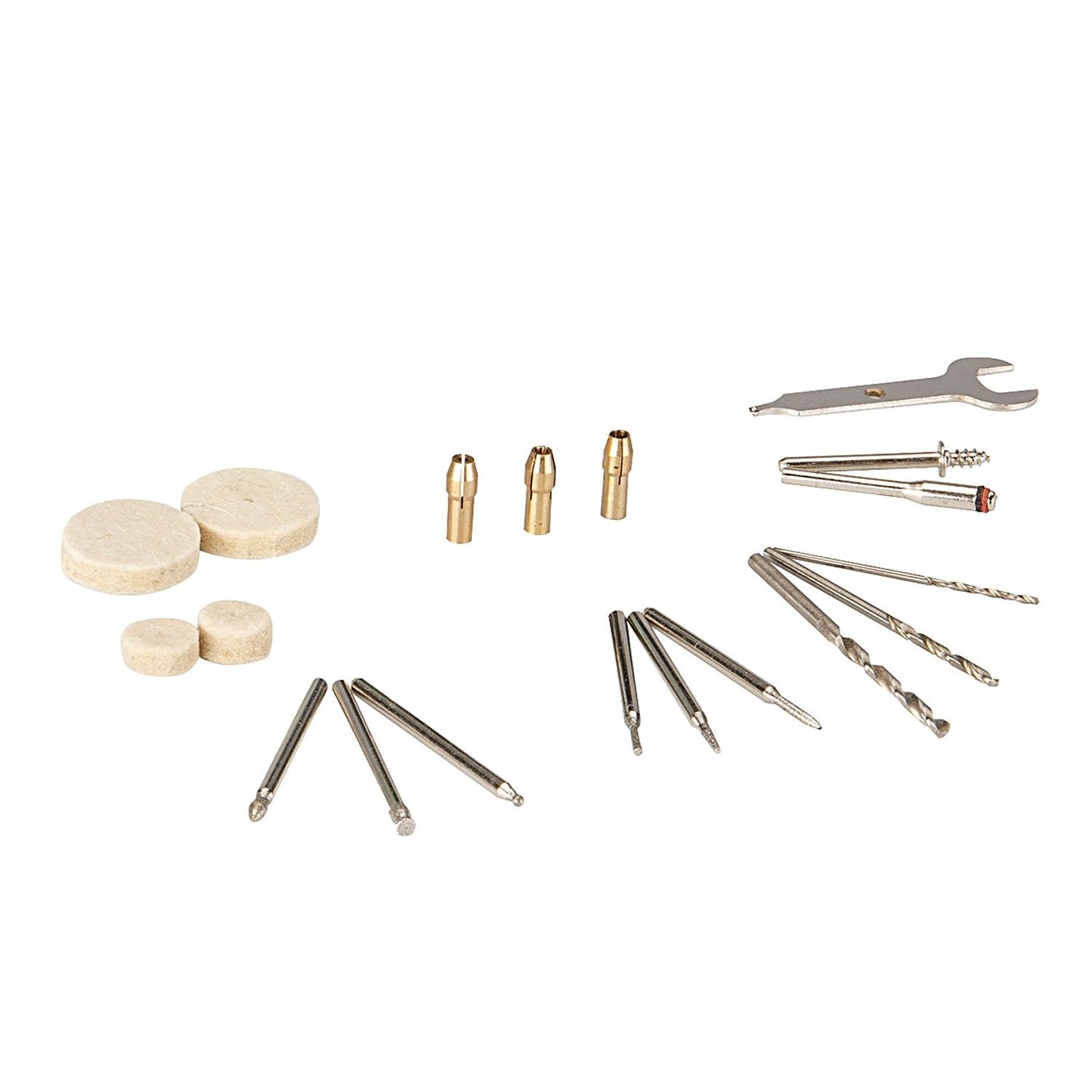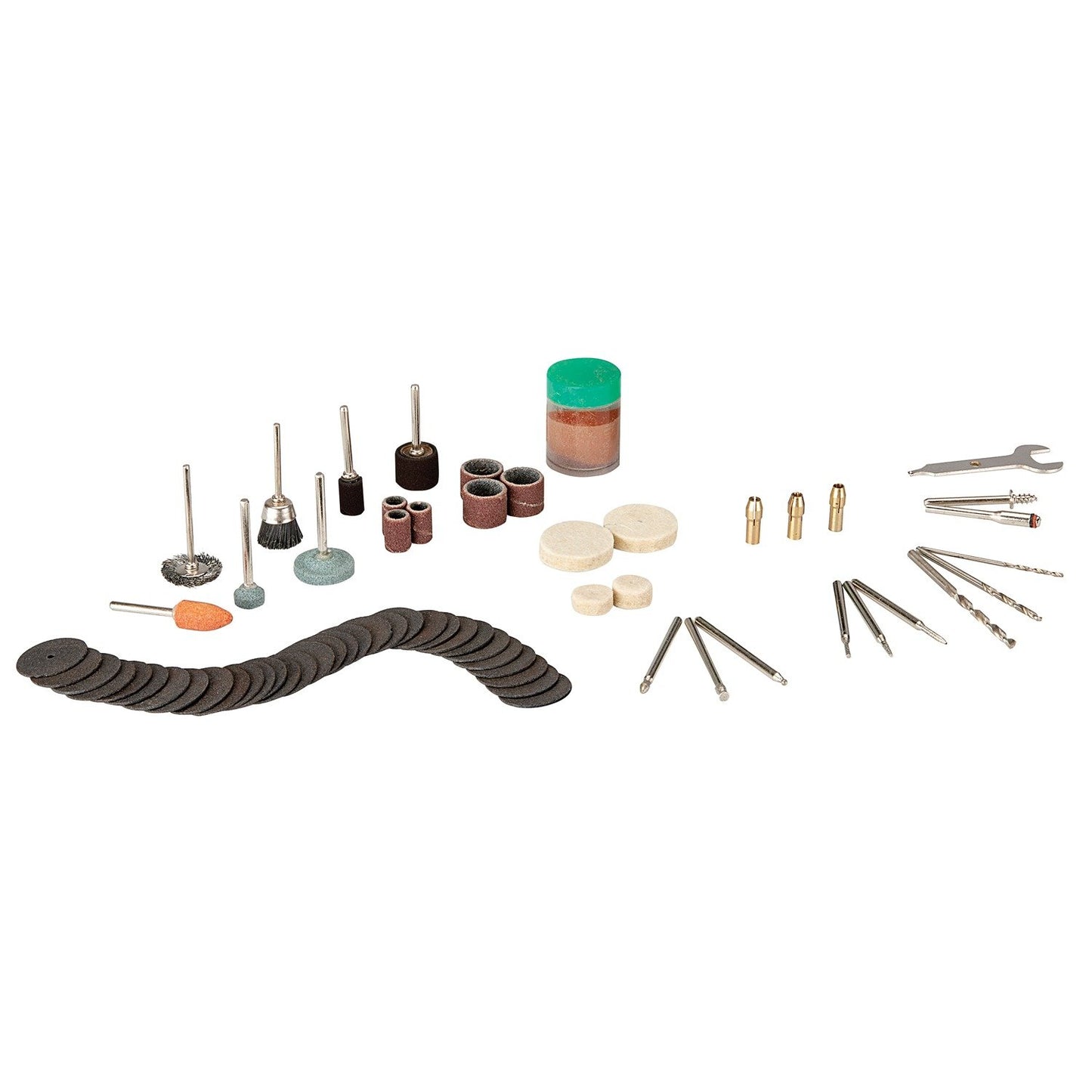 Accessories include 4 mandrels; 2 bands: 3/32 in. and 1/16 in.; 3 sanding wheels 1/2 in.; 3 sanding wheels 1/4 in.; 2 polishing wheels 1/2 in.; 2 polishing wheels 1/4 in.; polishing paste; nylon cup brush; nylon wheel brush; 2 silicon carbide grinding stones: 25/32 in. and 7/16 in.; aluminum oxide grinding stone: 3/8 in.; 3 drill bits: 1/8 in., 3/32 in., and 1/16 in.; 6 diamond grinding points 1/8 in.; and 34 cutoff wheels: 15/16 in. x 1/32 in.
