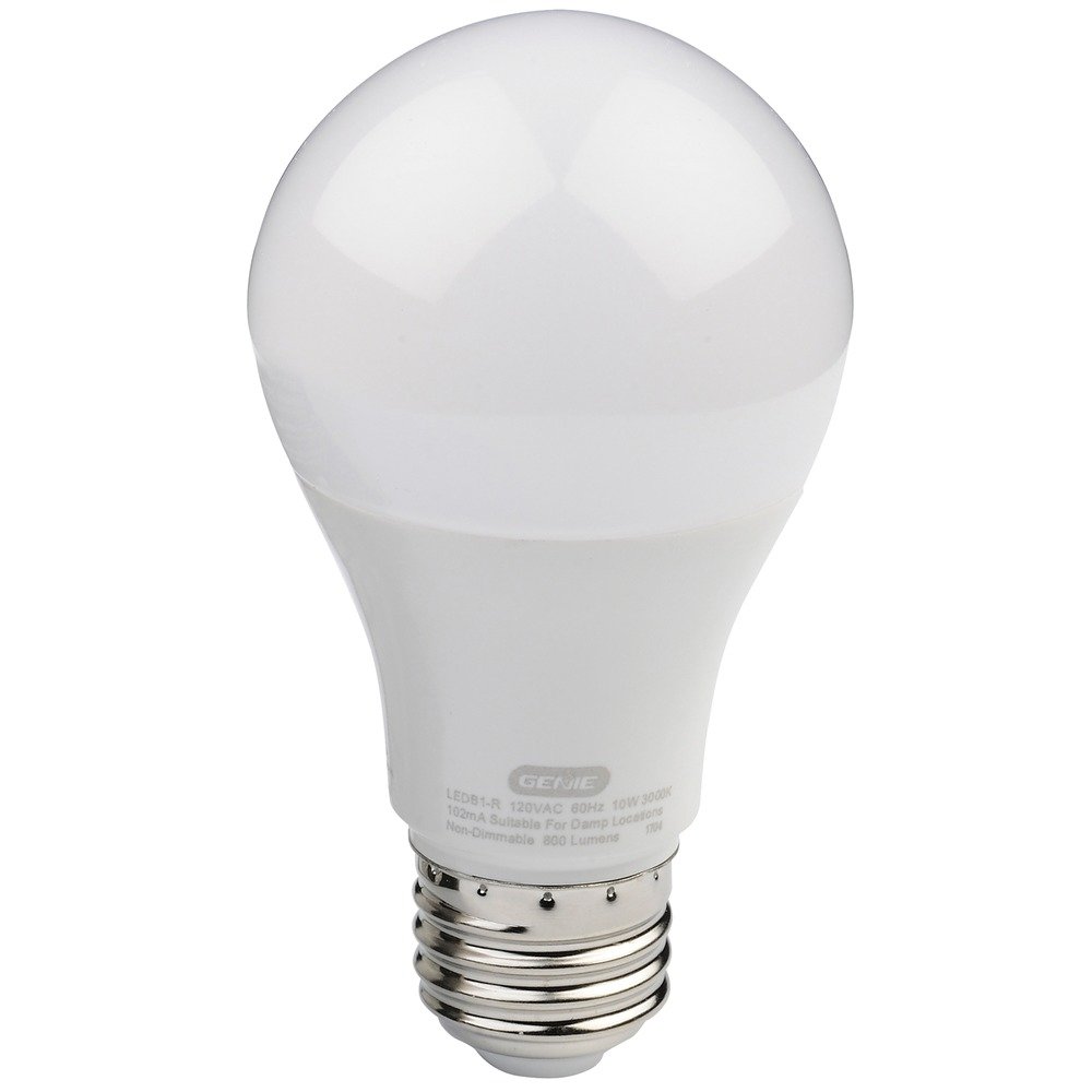The Genie Title 20 Approved Garage Door Opener LED Bulb is specifically designed for garage door openers and creates little or no radio frequency to interfere with openers. Traditional LED light bulbs can cause more problems in your garage door opener than they solve. Other bulbs can be more delicate and subject to breakage in the rougher environment of the garage, and some LED light bulbs actually cause interfere with radio frequencies, affecting the responsiveness or range of your opener’s remotes. The garage door opener bulb is also made to withstand the harsher environment of the garage. This bulb is cold weather tested and damp location rated to function without the many inconveniences associated with traditional bulbs used for this application. Garage door openers vibrate during operation, and this has the potential to shorten the life of normal light bulbs used in the opener. The Genie LED bulb is made of shatter and vibration-resistant materials and is tested to withstand 5G of shaking force, which far exceeds normal garage door opener vibration force. This bulb will operate for an estimated 25,000 hours, costing approximately $1.07/year, depending on local utilities, and will supply the equivalent light of an ordinary 60 watt incandescent light bulb. Get energy savings and a bulb that will last without sacrificing brightness! This bulb is Title 20 approved for California residents.
