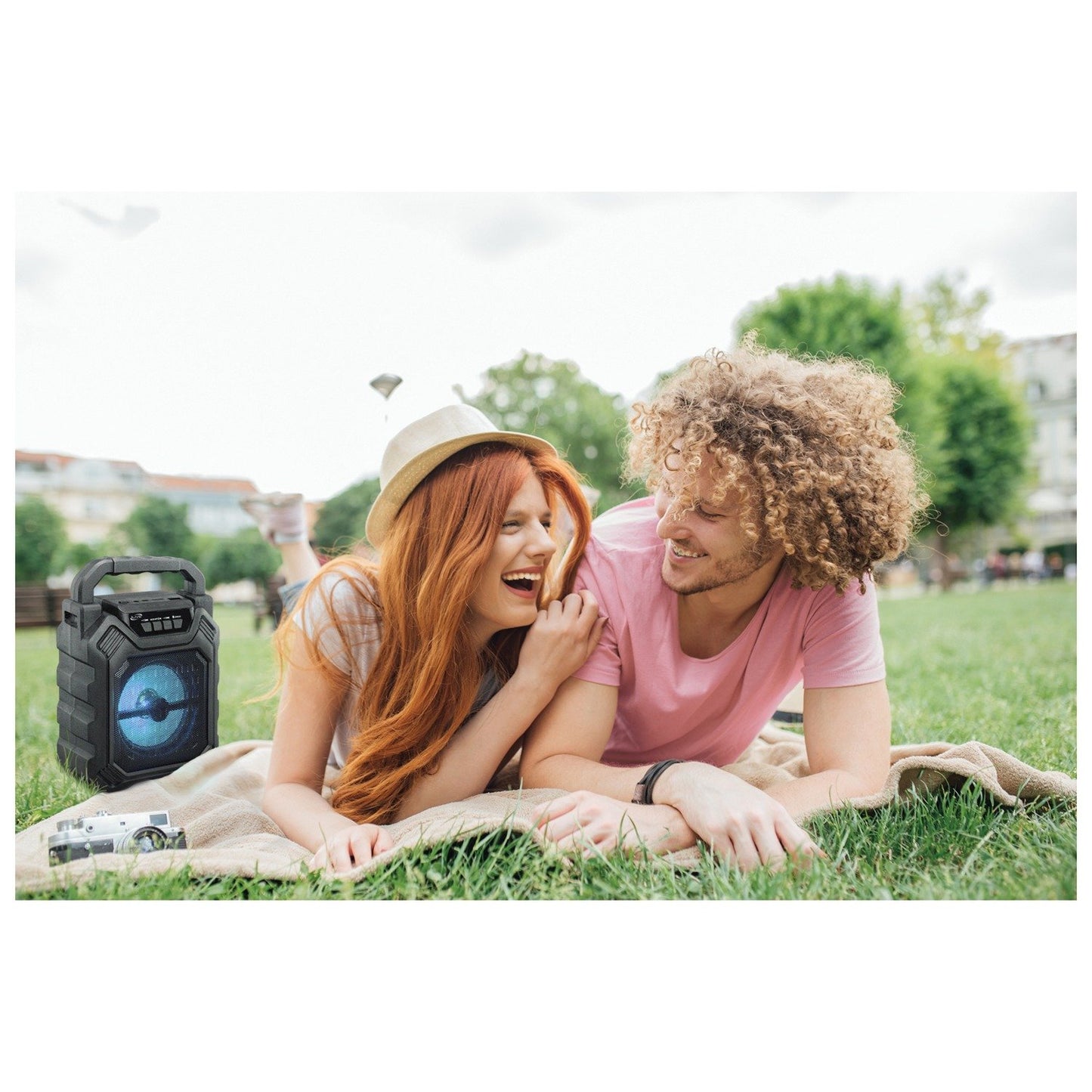 Take the party wherever you roam with the iLive ISB199B Miniature Bluetooth Tailgate Portable Party System! It features Bluetooth 5.0, Digital FM radio, aux input, and USB port and SD memory card reader for MP3 files). Built to disperse sound, this easily transported miniature tailgate speaker will be your go-to for parties and tailgates alike. The mesmerizing LED light effects bring your parties to life and 6-hour battery life make this small tailgate speaker a must-have.