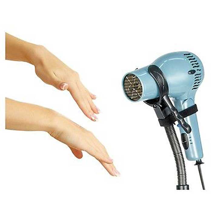 This amazing styling stand holds hair dryer, leaving both hands free for styling with brush and comb.