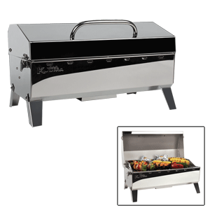 It is compatible with 1 lb. throwaway propane cylinders. This high quality lightweight 304 stainless-steel barbecue increases flavor while minimizing flare-ups. It has a large cooking area of 160 square inches, and the stainless-steel burner heats up fast, is easy to clean, and resists rust. The integrating folding legs are perfect for tabletop use and the grill is quick and easy to assemble.