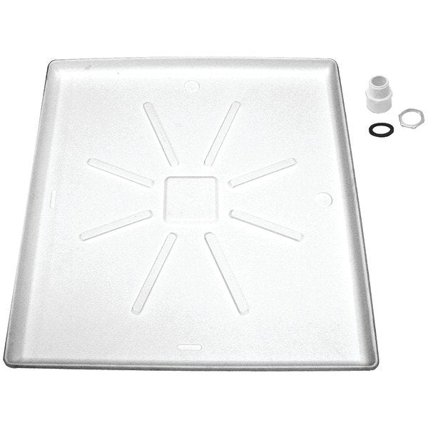 The Lambro Standard Sized Washer Tray is made to go under washers to protect your floor from leaks and overflows. Not only does it protect your floor from scuffs, but it also collects and drains water to keep it from damaging any part of your home. This washer tray is recommended for second-floor laundry areas where water could damage the floor and ceiling below. Along with the tray comes a drain fitting. The instructions provide detailed descriptions for easy installation and usage.