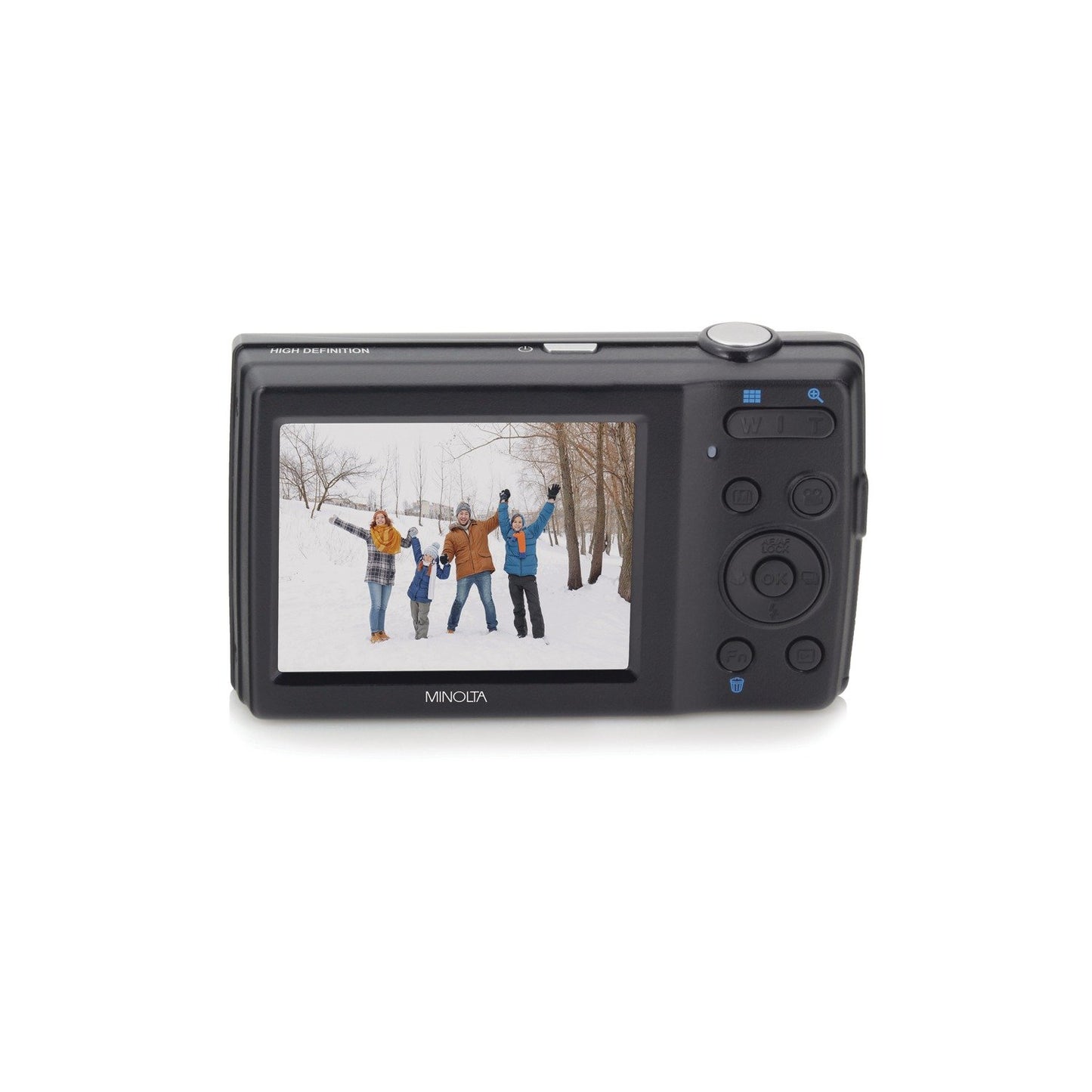 The Black Minolta 20-Megapixel MN5Z HD Digital Camera with 5x Zoom is a compact, point-and-shoot digital camera featuring a 20-megapixel high-sensitivity CCD sensor to produce high-resolution still images and HD 720p videos. The built-in 5x optical zoom lens provides a focal length range of 26 mm to 130 mm, covering wide-angle to telephoto lengths. A built-in 2.7-in. LCD, face detection, smile/blink shutter and 31 settings of scene modes make shooting the just-right shot easy in any environment.