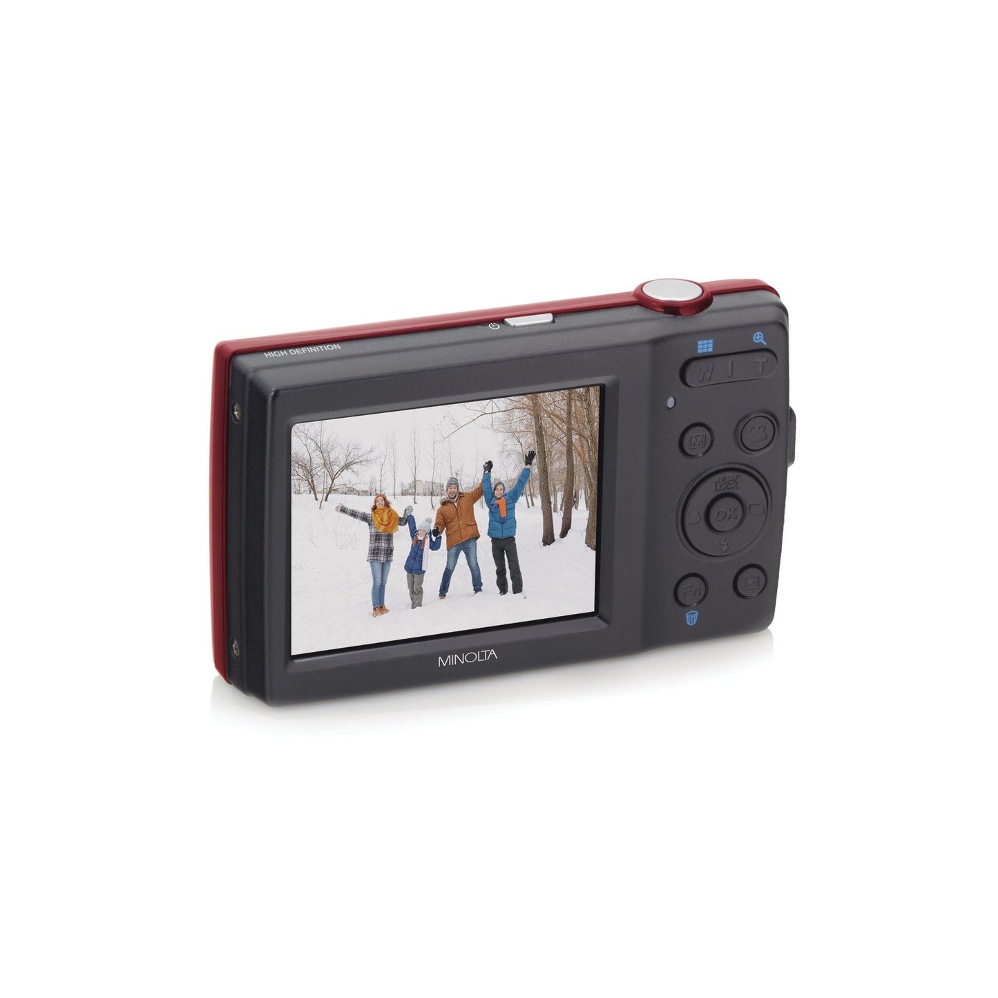 The Red Minolta 20-Megapixel MN5Z HD Digital Camera with 5x Zoom is a compact, point-and-shoot digital camera featuring a 20-megapixel high-sensitivity CCD sensor to produce high-resolution still images and HD 720p videos. The built-in 5x optical zoom lens provides a focal length range of 26 mm to 130 mm, covering wide-angle to telephoto lengths. A built-in 2.7-in. LCD, face detection, smile/blink shutter and 31 settings of scene modes make shooting the ideal shot easy in any environment.