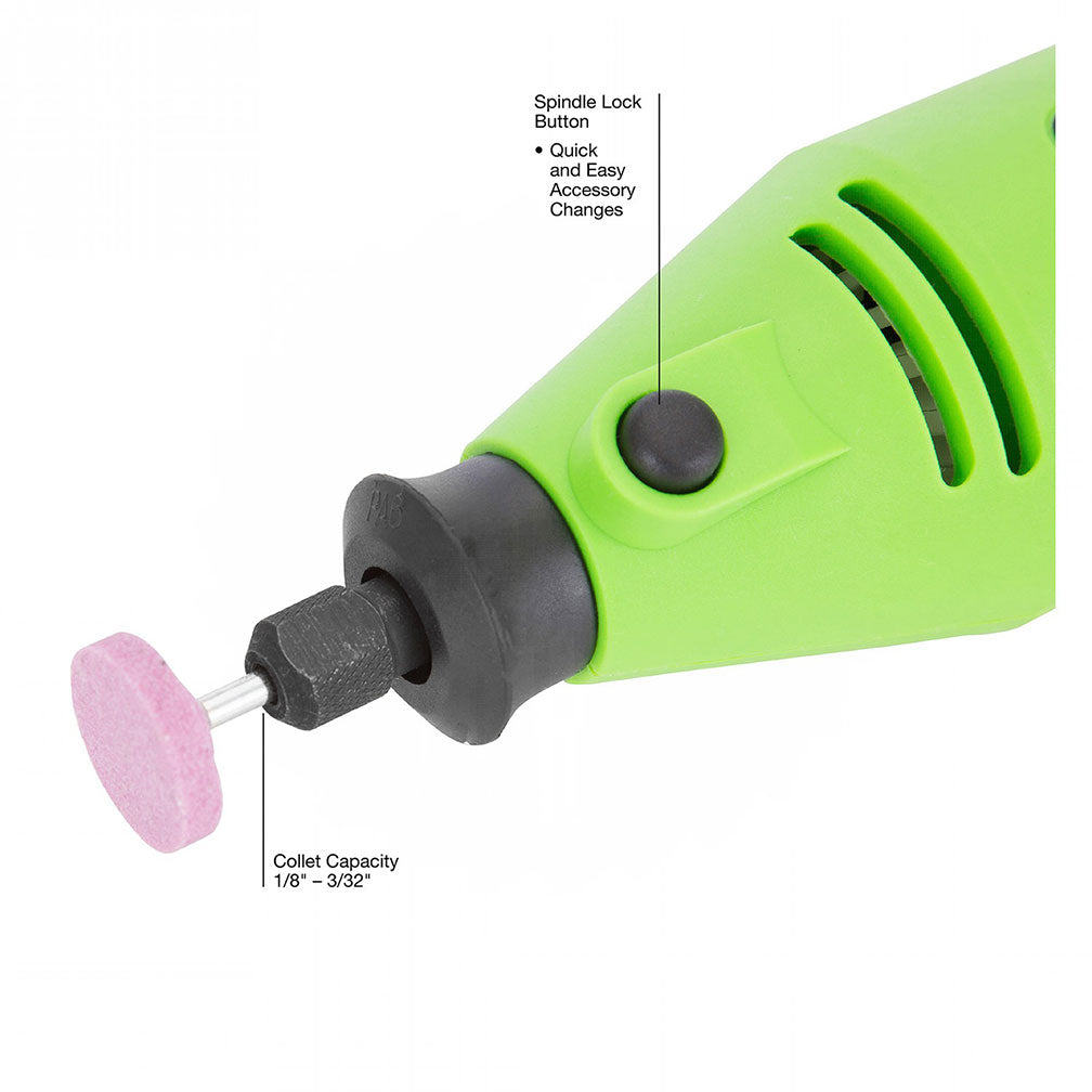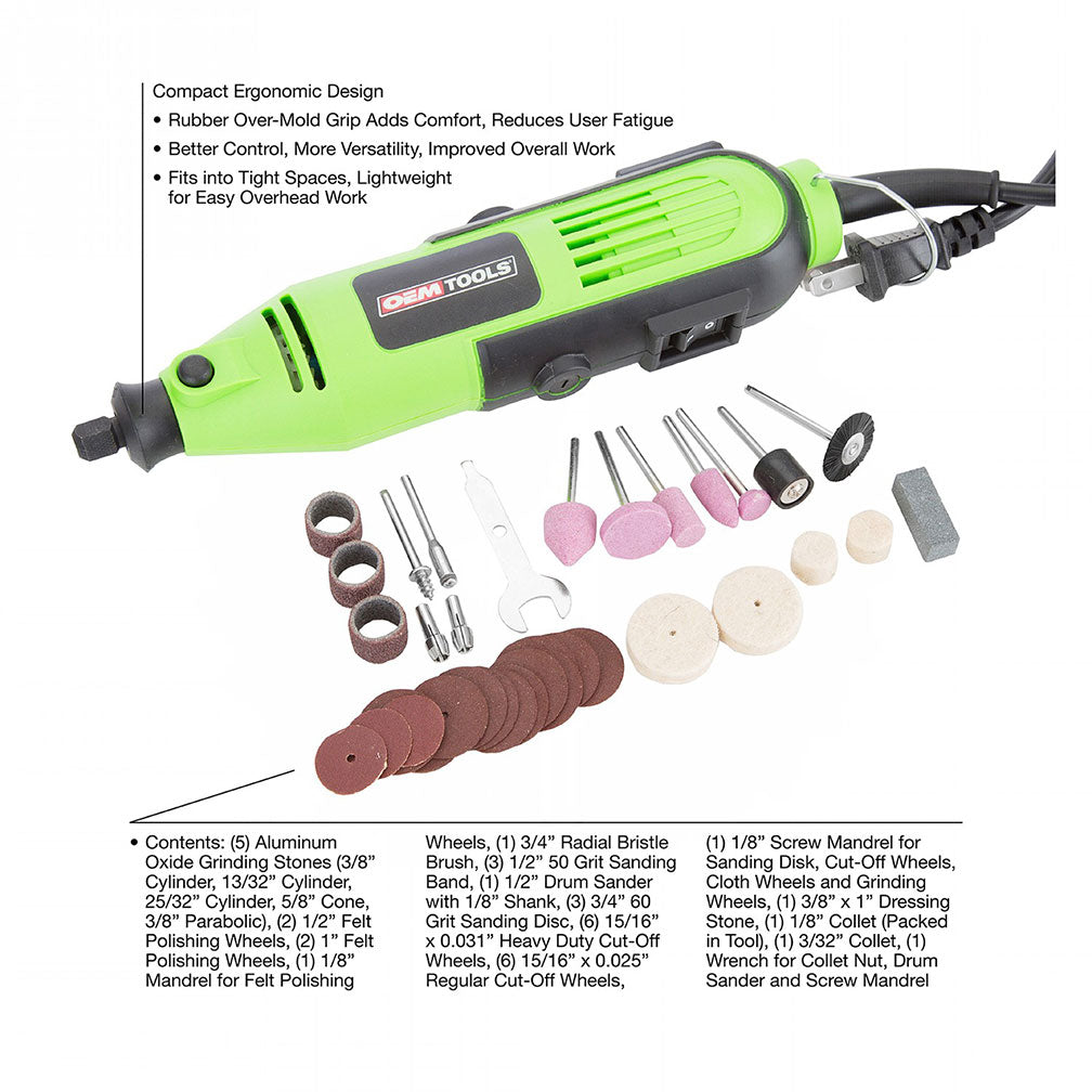 The Oemtools Rotary Tool 35 Piece Accessory Kit Polishes, Grinds, Cuts, Shapes And Sands Metals. Its Powerful 1.2 Amp Motor Will Grind Through The Toughest Jobs And WonT Stall. This Rotary Tool Has A 1/8 In. Collet With Housing That Accepts Most Brand Name Accessories And Attachments.