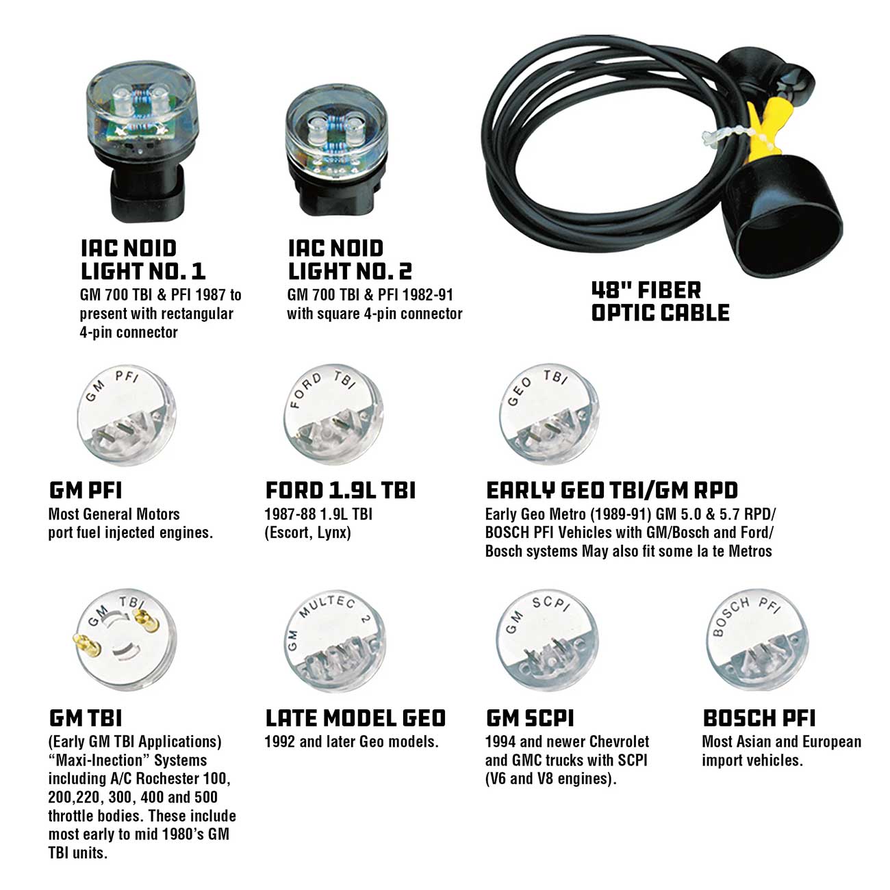 • Kit Includes: 8 Fuel Injection Test (noid) Lights; 2 Idle Air Control Valve Test Lights; 48-inch Fiber Optic Cable Extension For Maximum Visibility