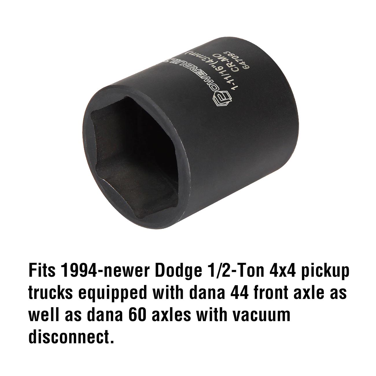 specialty Tools Make The Job Safer And Faster. The Powerbuilt 1/2″ Drive 1-11/16″ Dodge Spindle Nut Socket Does Just That While Servicing Dodge Axles. Designed To Fit 1994 And Newer Dodge 1/2 Ton Pickup Trucks Equipped With Dana 44 Front Axles And Dana 60 Axles With Vacuum Disconnect. This High-quality Socket Is Constructed Of Chrome Molybdenum Impact-rated Steel And Has A Durable Manganese Phosphate Coating For Long Tool Life.