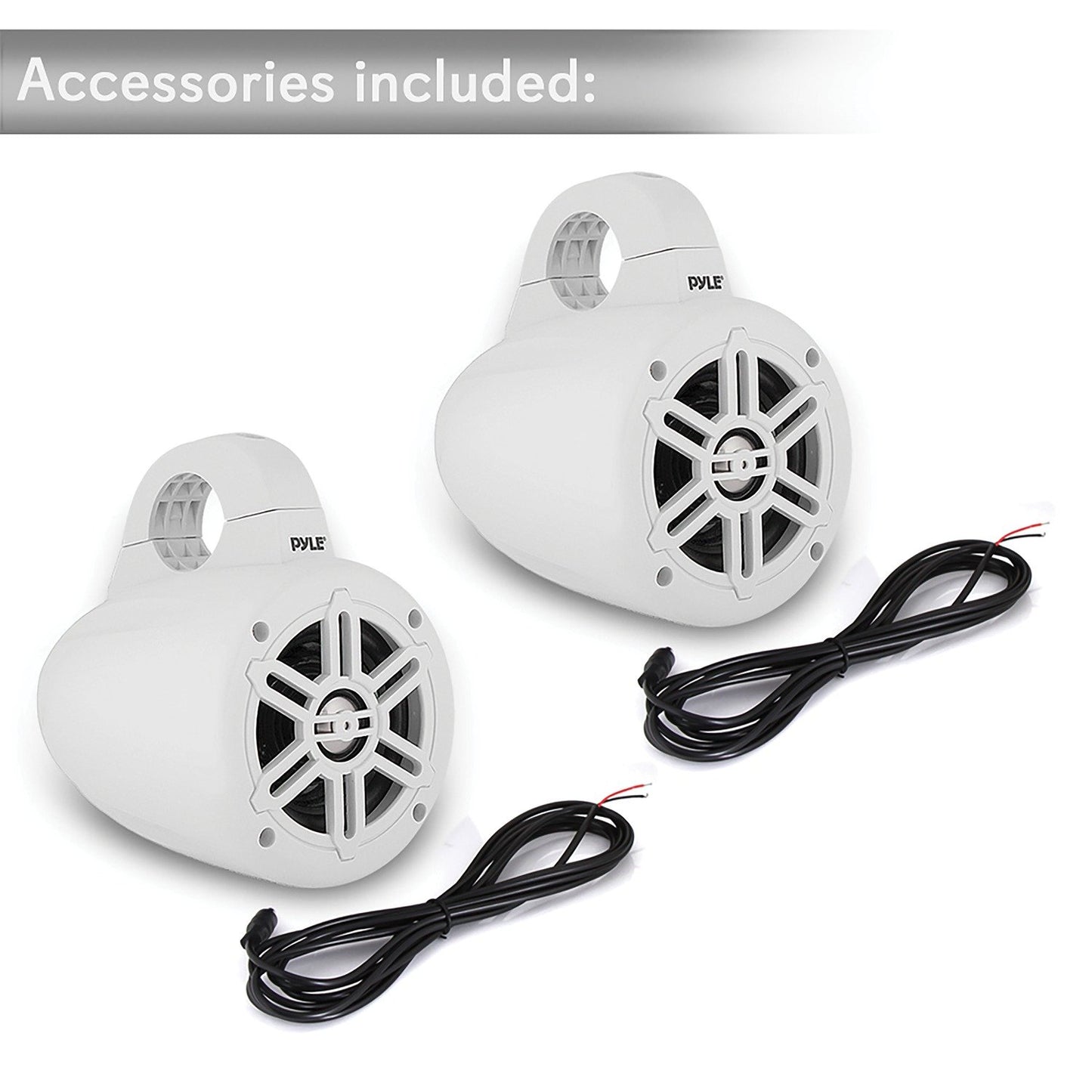 The pair of Pyle 4 In. 300 Watt Waterproof Marine Wakeboard Tower Speakers are constructed with marine applications in mind. They are water resistant and are ideal on the dock or at sea. Each speaker is equipped with a 4 in. woofer for a booming low end and a 1 in. titanium dome tweeter for sweet highs for a frequency response of 70 Hz to 20 kHz. Heavy duty construction extends the life of your product while weather resistant housing keeps your sound distortion-free. You can even use them in powersports applications! Mounting clamps are integrated into the housing.