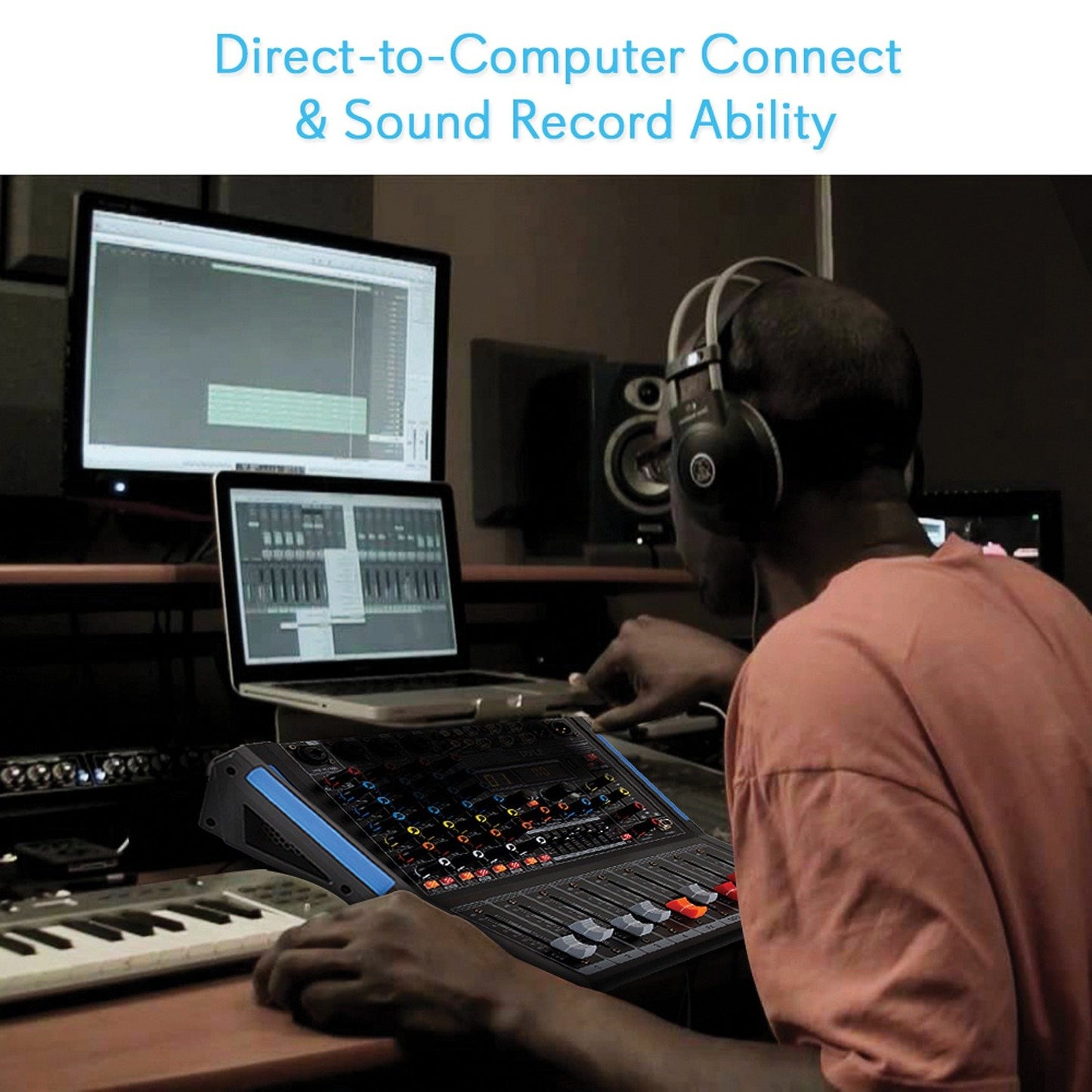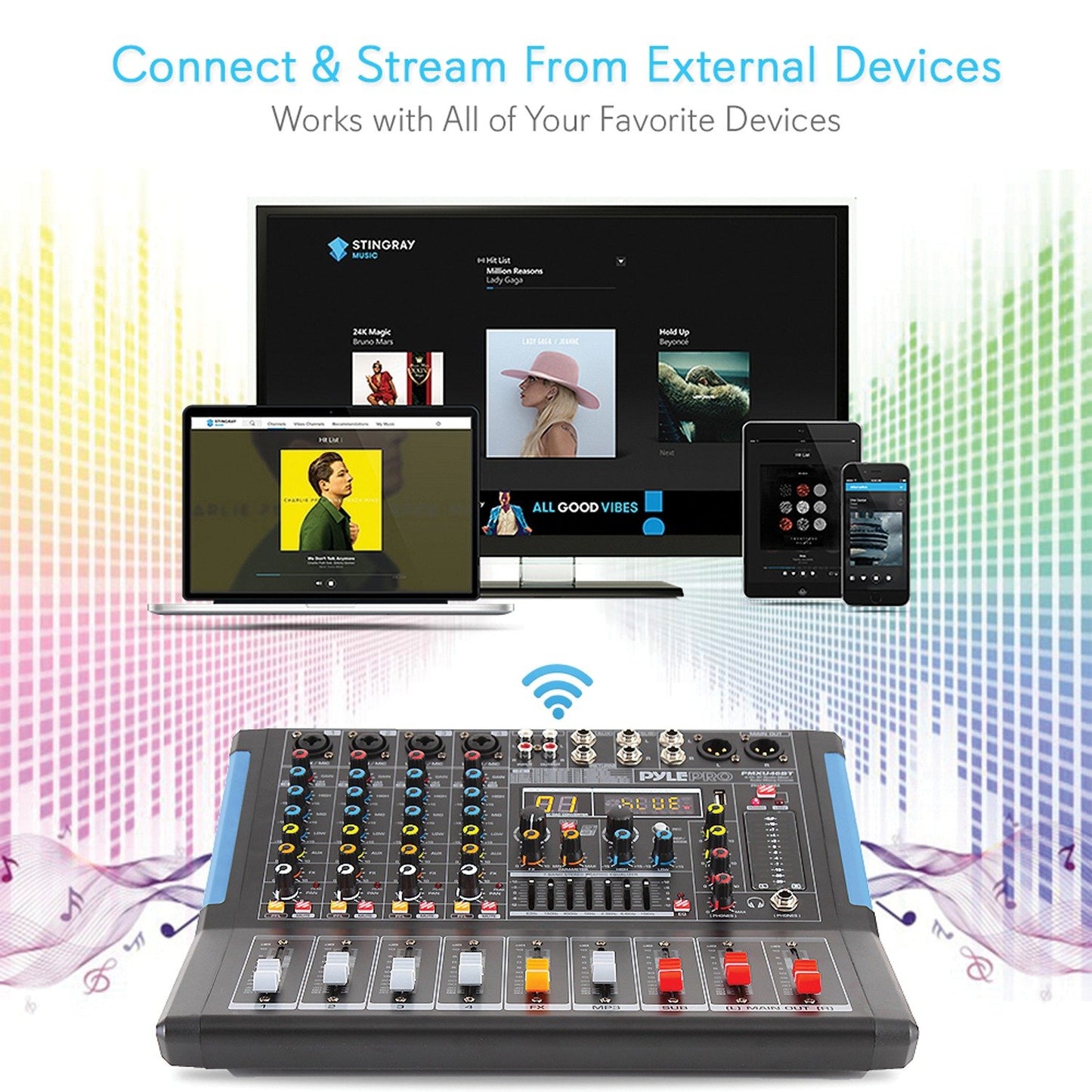 The Pyle 4-Channel Bluetooth Studio Pro Audio DJ Mixer is a compact 4-channel, Bluetooth-enabled audio mixer designed to provide multichannel mixing capabilities for DJs, musicians, sound engineers, and performers in clubs, conferences, houses of worship, and live stage applications. It features 4 XLR 1/4 in. combo inputs and RCA input/output jacks. The microphone preamps offer selectable 48-volt phantom power and up to 64 dB of gain.