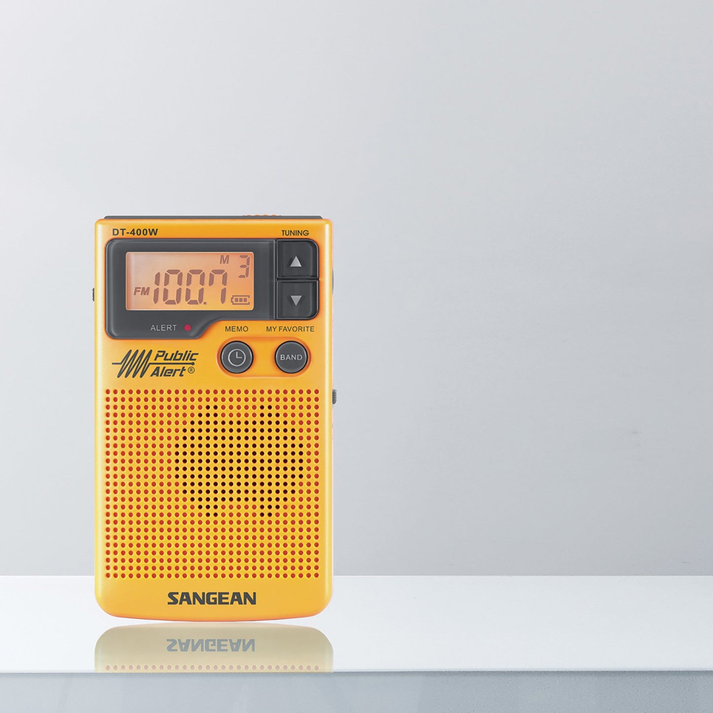 The Sangean Model DT-400W is the last pocket radio you will ever need to buy. It has about everything you could want, and then some, in a small, pocket-sized portable radio. As an example, the NOAA Weather Alert Emergency Channel sounds a very loud audible tone when an extreme weather condition is imminent and/or a police emergency or a child abduction has occurred or any type of public awareness becomes critical. To conserve battery life, you can also preset the amount of time you want the radio to monitor NOAA weather. In addition to emergencies, the 7 NOAA channels provide up-to-date general weather information—useful if you're planning a trip or just a picnic for the weekend. The large, backlit LCD display clearly displays the time, station, battery life indication, alert indication, and all other pertinent information. Its advanced PLL synthesized digital receiver provides drift-free AM/FM reception. Dynamic Bass Boost adds to your stereo musical listening pleasure and 19 random preset selections lets you mix AM/FM stations with immediate access through the My Favorites button. Other features include Lock Switch to prevent accidental setup changes, 90-minute auto shutoff, built-in speaker, auto station seek, and a removable belt clip.