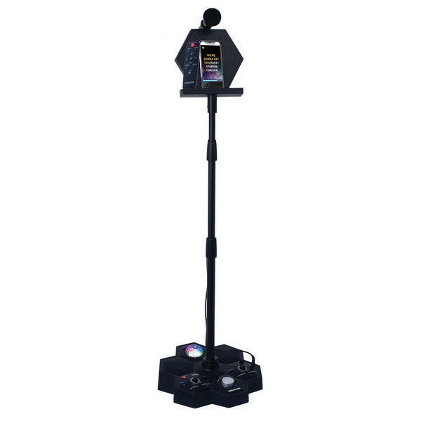 • Compatible with all karaoke apps;• 10 voice effects such as harmonize, echo, baritone, and alien;• 16 room-filling multi-color light effect modes ;• 8 sound effects including applause, cheers, DJ scratch, and air horn;• Dual microphone inputs for duets;• Includes speaker, microphone, remote, AC adapter, remote, and microphone with cradle;
