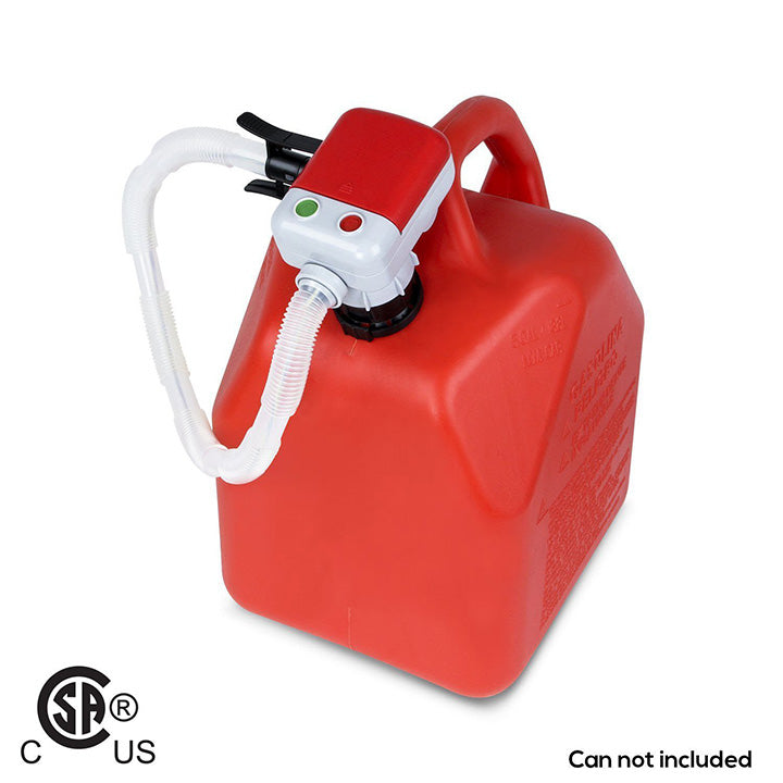 3 gallons per min / Requires 4 AA batteries (which are not included) / Flexible Intake hose / No-spill Auto-Stop Nozzle