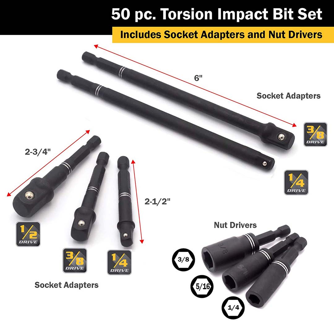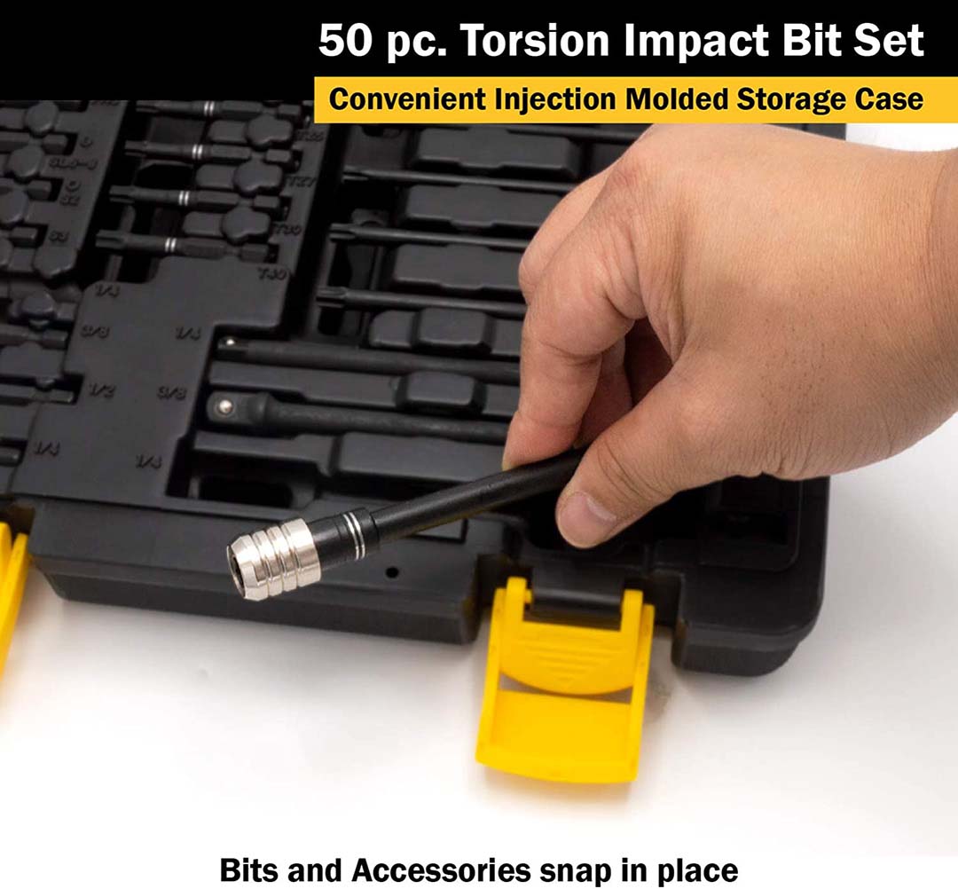 Torsion Impact Bit Set. 50-Piece Set Of Impact Bits And Adapters With Torsion Flex Design To Withstand Use From Impact Drivers. Set Includes: Phillips, Square Drive, Metric And Sae Hex, Star And Slotted Bits With Assorted Adapters And Chucks. Magnese Phosphate Construction With Polished Ring. Includes Convenient Storage Case.