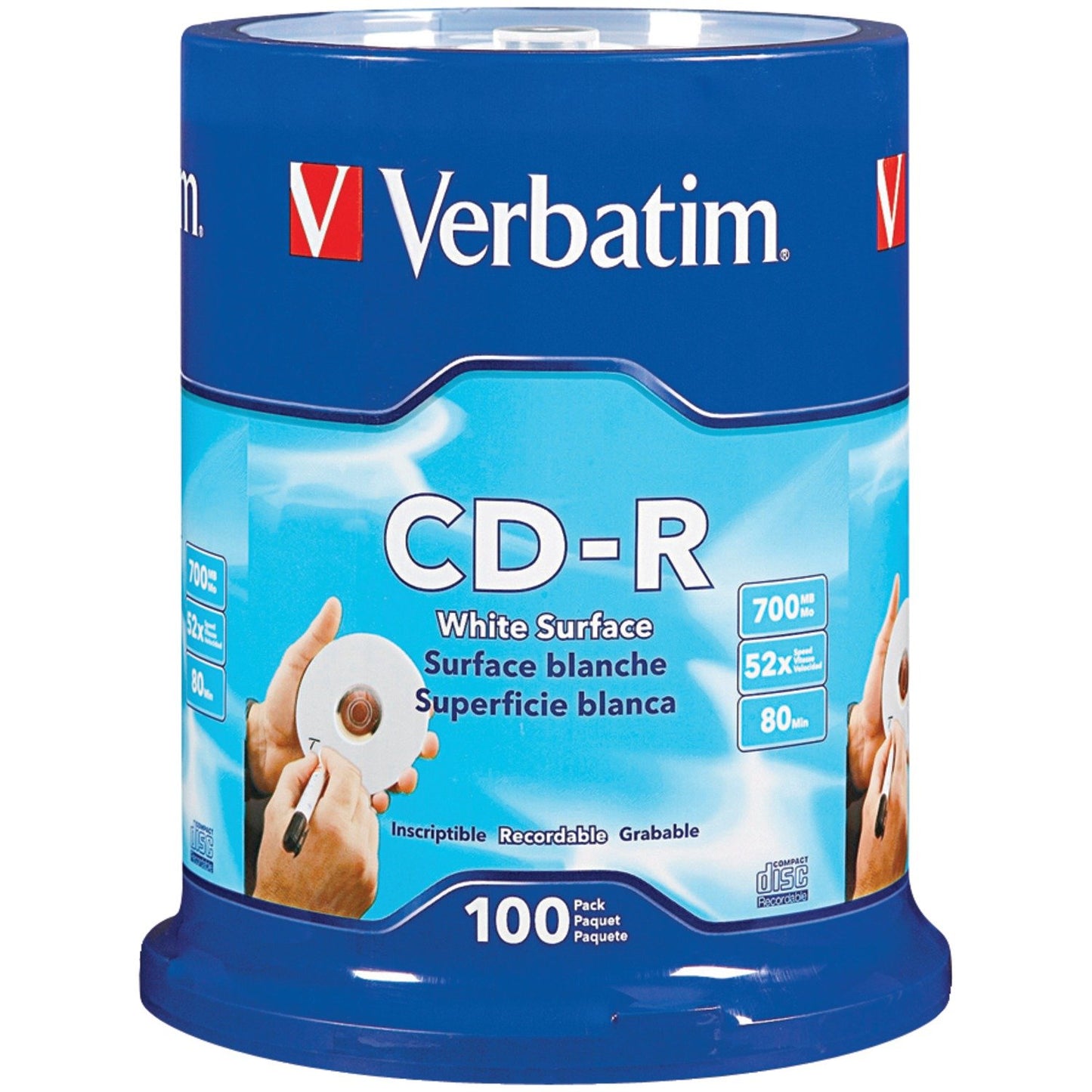 Verbatim's 700 MB 80-Minute 52x CD-Rs provide consumers with a quality, convenient and economical storage solution for a wide range of applications. Use Verbatim's blank white media to produce your own CDs for prototype software programs, distribute digital photo albums to friends and relatives or create a backup of your desktop files including word processor documents, spreadsheets and presentations. CD-recordable disks are write-once media. This spindle contains 100.