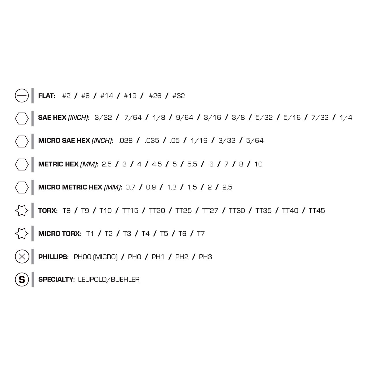 Metric Hex (mm): 2.5, 3, 4, 4.5, 5, 5.5, 6, 7, 8, 10