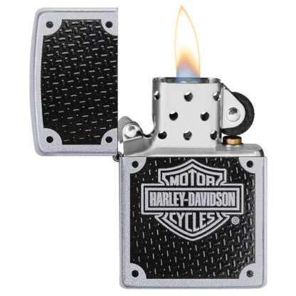 this Satin Chrome Lighter Features The Harley-davidson Bar And Shield Logo Woven Into A Carbon Fiber Background. Comes Packaged In A Gift Box. For Optimal Performance, Fill With Zippo Lighter Fuel